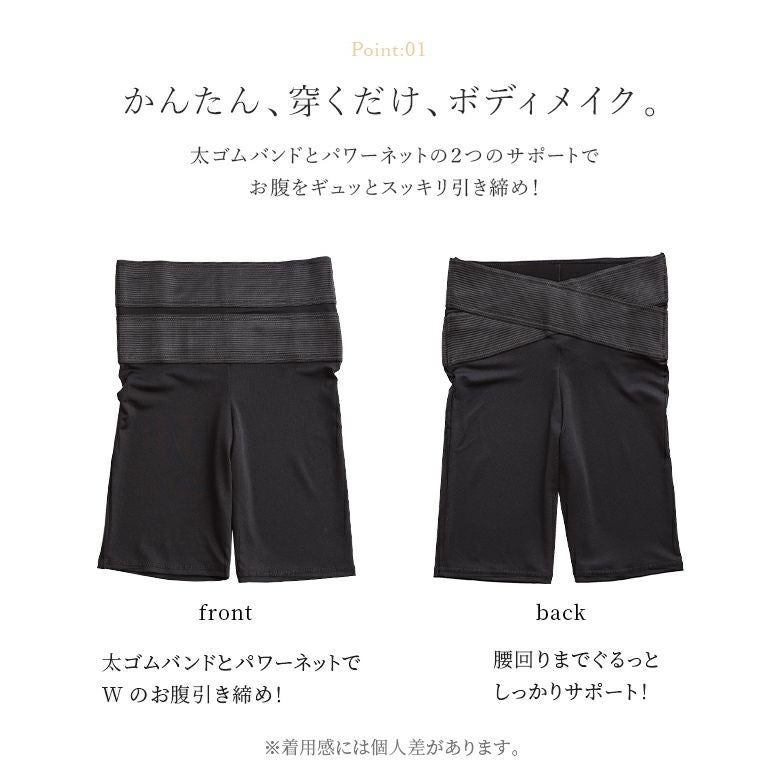太ゴムバンドとパワーネットの2つのサポートで、お腹からウエストまでの広範囲をスッキリ引き締めて、腰回りまでぐるっとしっかりサポート。