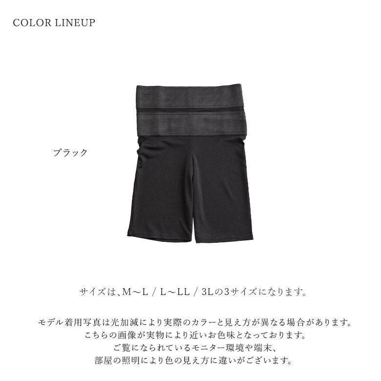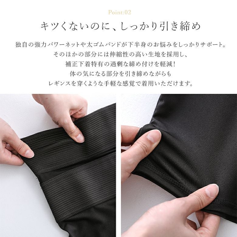 伸縮性の高い生地を採用し、補正下着特有の過剰な締め付け感を軽減。体の気になる部分を引き締めながら、着心地も快適なレギンスです。