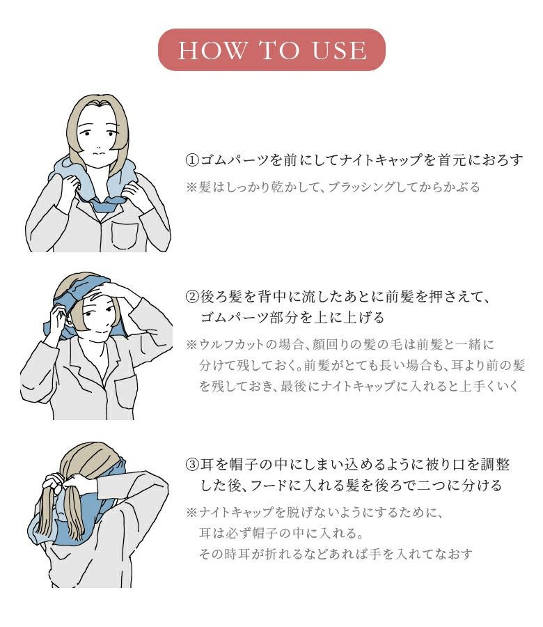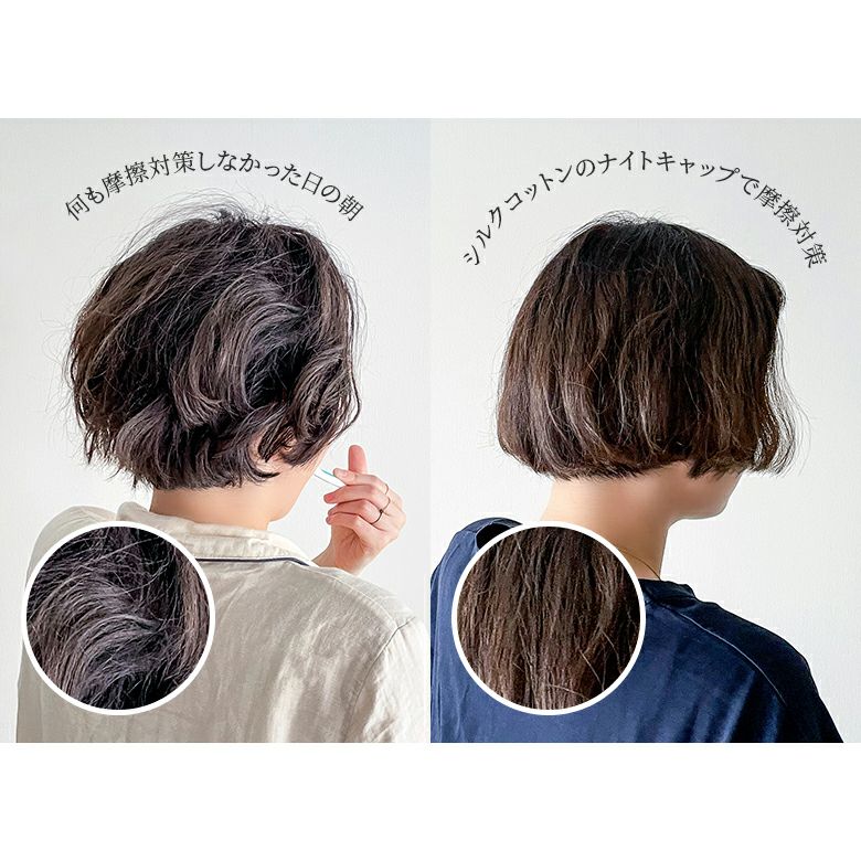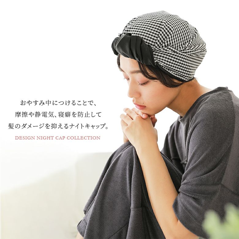 お休み中につけることで、摩擦や静電気、寝癖を防止して髪のダメージを抑えるナイトキャップ。