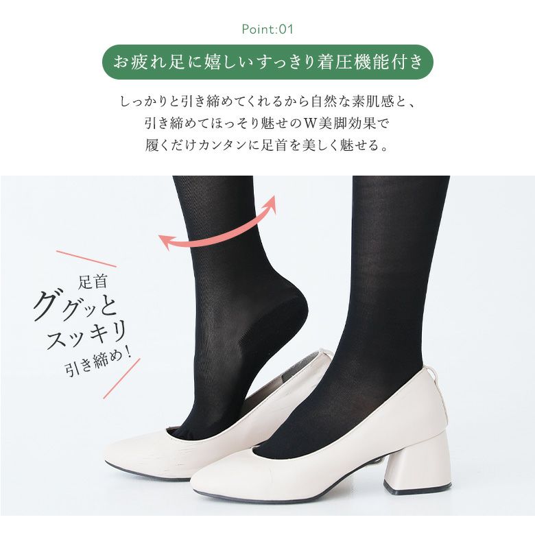しっかりと引き締めてくれるから自然な素肌感と、引き締めてほっそり魅せのW美脚効果で履くだけカンタンに足首を美しく魅せる。