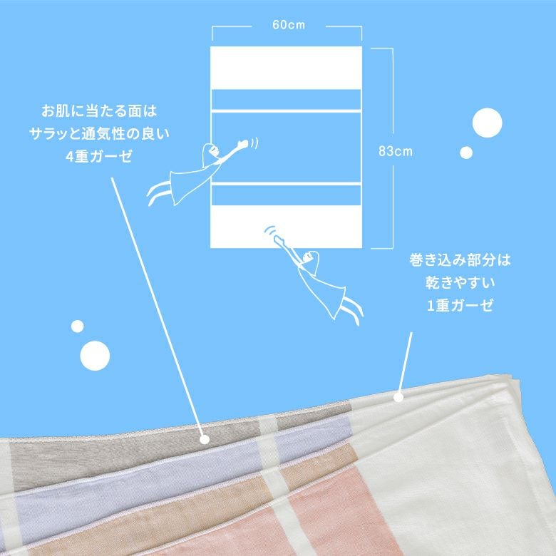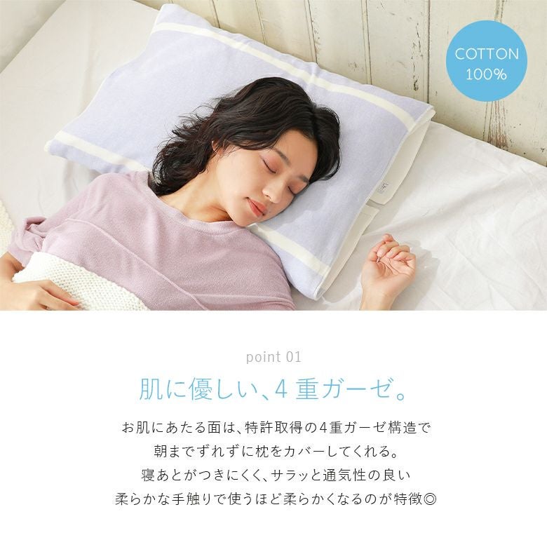 特許取得の100%綿を使用した4重ガーゼで柔らかくさらりとした肌触り!寝跡がつきにくく、サラッと通気性が良く優しい手触りで使うほど柔らかくなるのが特徴。