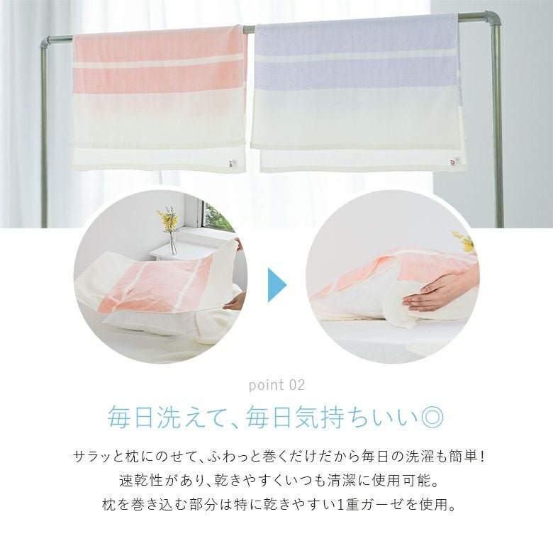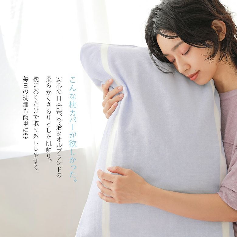 さらっと枕にのせて、ふわっと巻くだけの簡単仕様♪毎日洗えて清潔に使える、今治タオルを使用したタオル地の枕カバーです。