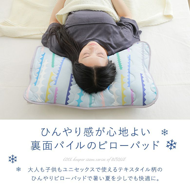 大人も子供もユニセックスで使えるテキスタイル柄のピローパッドで暑い夏を少しでも快適に♪ひんやり感が心地よい裏面パイルのピローパッドです。