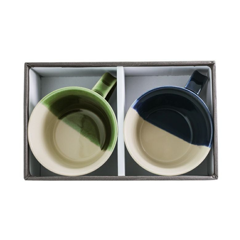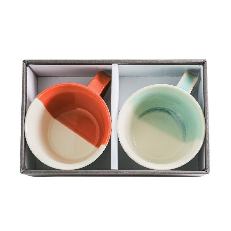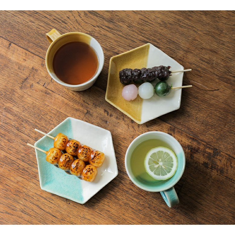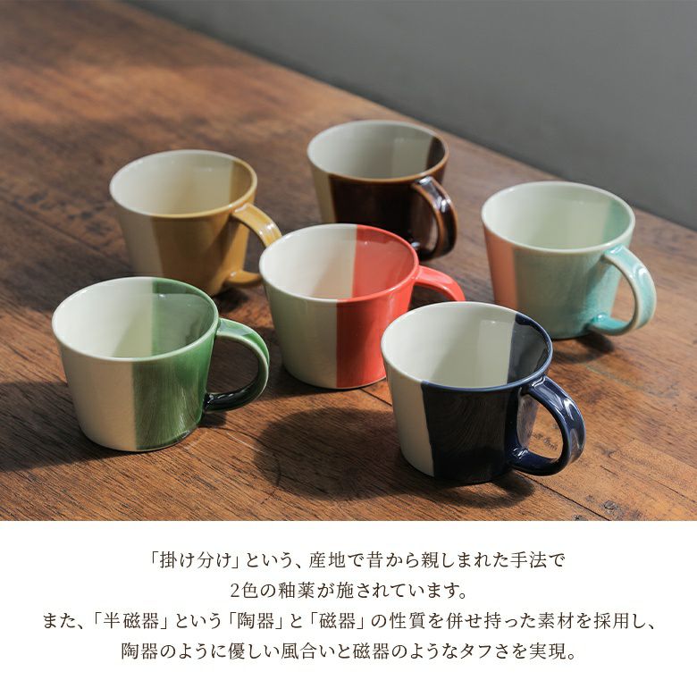「掛け分け」という、産地で昔から親しまれた手法で2色の釉薬が施されています。また、「半磁器」という陶器と磁器の性質を併せ持った素材を採用し、陶器のように優しい風合いと磁器のようなタフさを実現。
