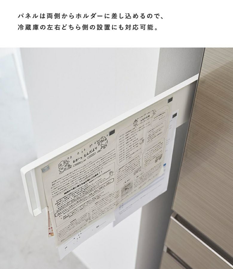 冷蔵庫横にプリントやチラシを隠せる、スライド式収納パネル。