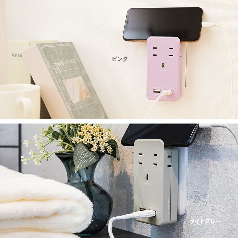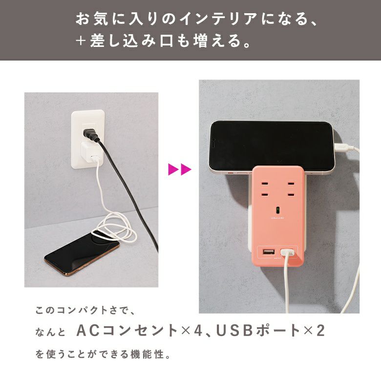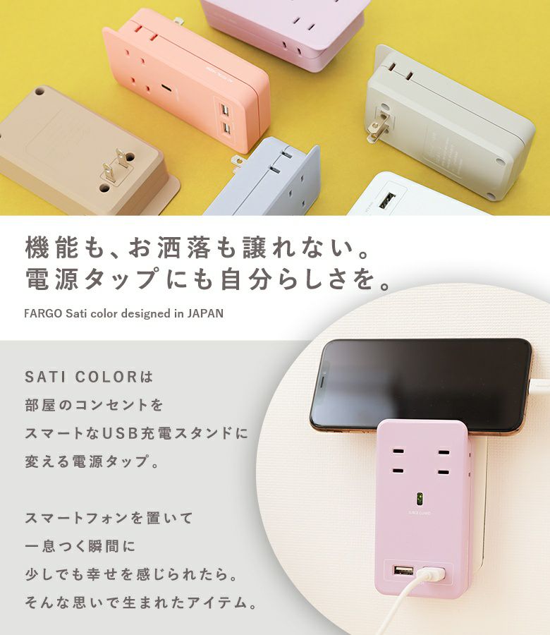 SATI COLORは部屋のコンセントをスマートなUSB充電スタンドに変える電源タップ。コンパクトながらも、家庭用ACコンセント×4とUSBポート×2を使うことができる機能性が魅力です。