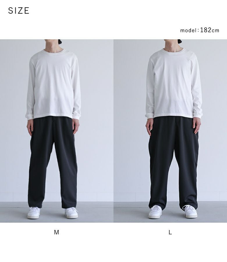 【普段着用】 Tops: L/LL Bottoms: L/LL | 【M】 着丈(ウエスト穿き):ちょうどくるぶし位 ウエスト:ジャスト ヒップ:ややゆったり 太もも周り:ややゆったり 全体:ややゆったり