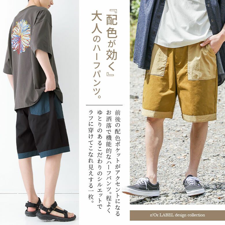 前後の大きめ配色ポケットがお洒落なアクセントになり、機能的なハーフパンツ。程よくゆとりのあるこだわりのシルエットでラフに穿けてこなれ見えする一枚です。