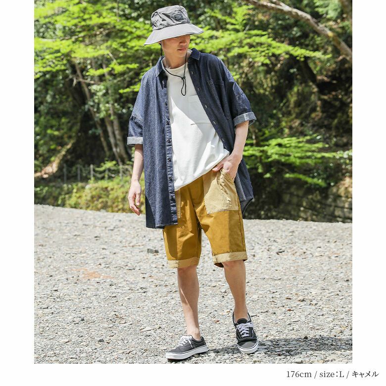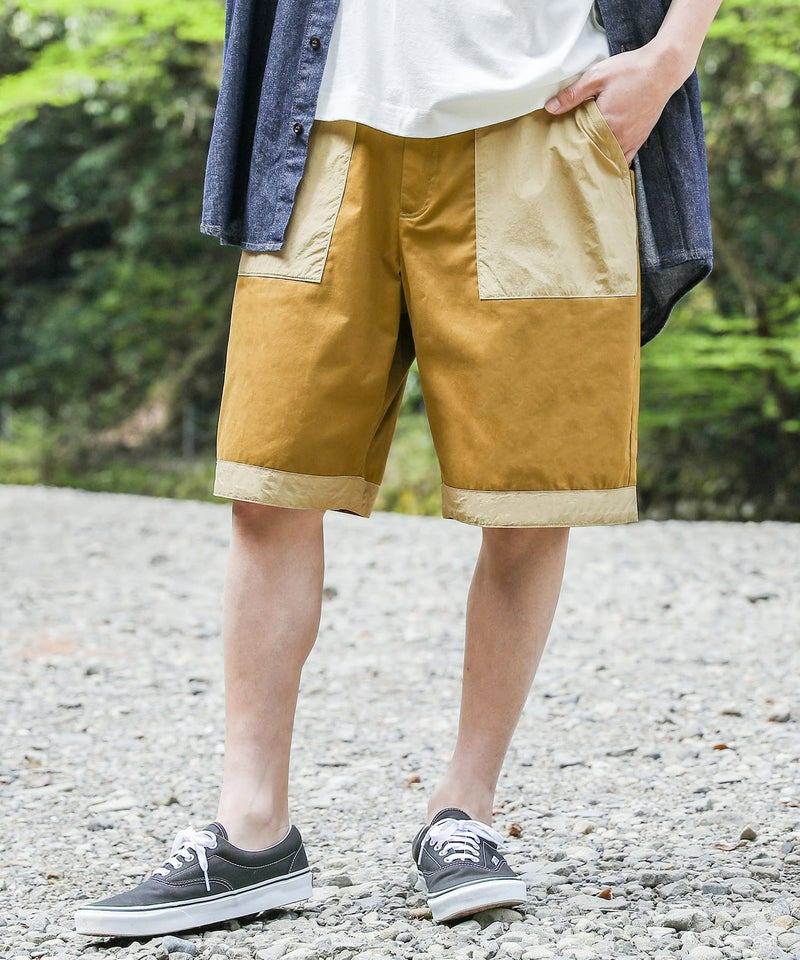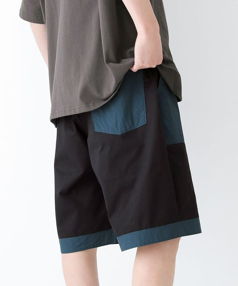 コットン混の布帛としわ感のあるナイロン生地を合わせた異素材デザイン。さらりと軽い穿き心地で、日常使いはもちろん、レジャーやアウトドアにも活躍します。