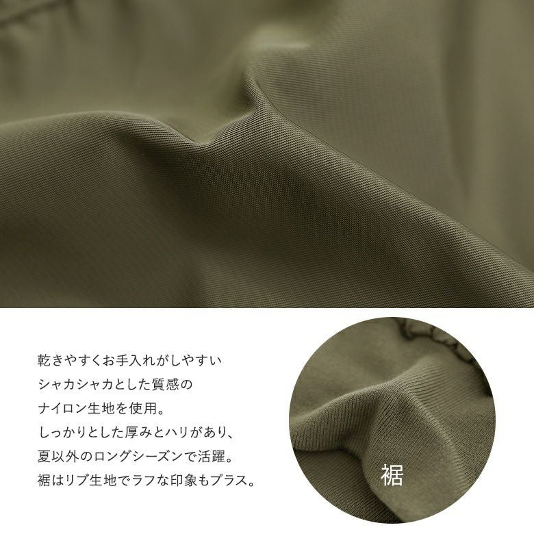 乾きやすくお手入れがしやすい、シャカシャカとした質感のナイロン生地を使用。しっかりとした厚みとハリがあり、ロングシーズンで活躍します。裾のリブ生地でラフな印象もプラス。