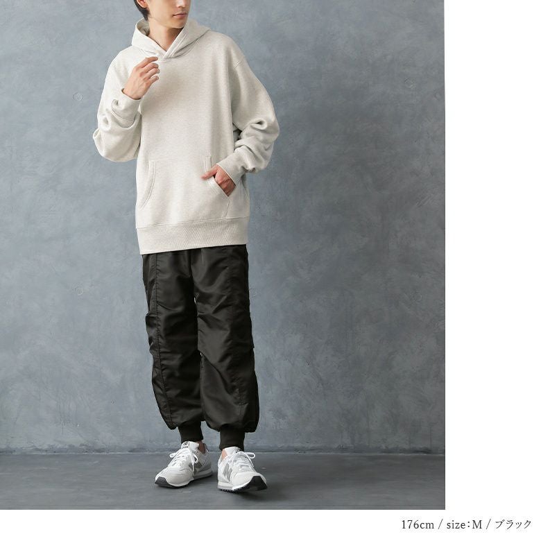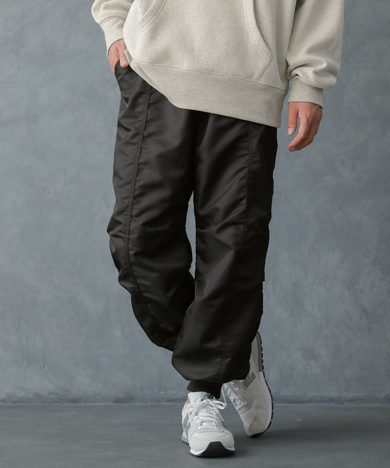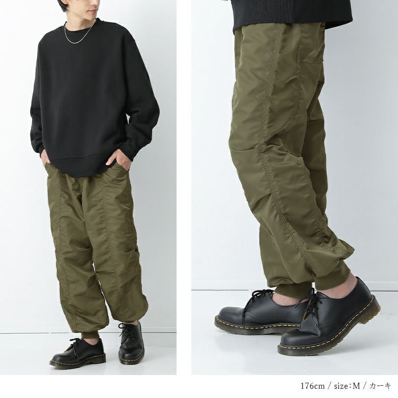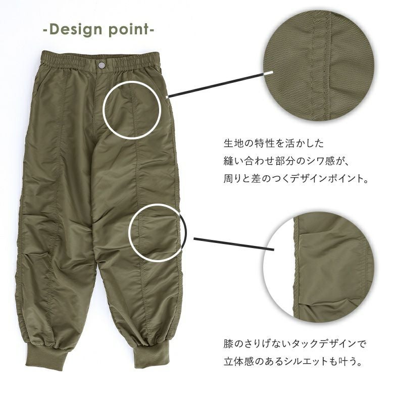 中心の切り替え部分に施した縫い合わせ部分のシワ感でボリュームのあるシルエットを実現した、大人のためのジョガーパンツ。