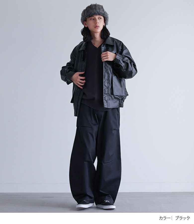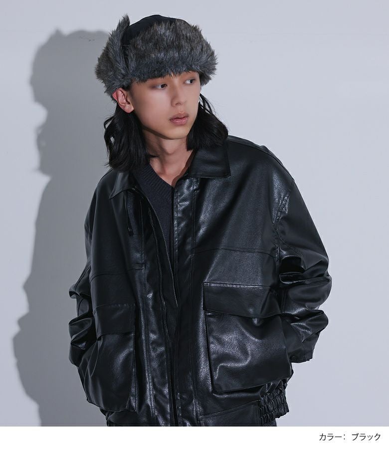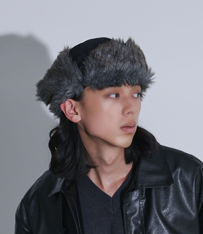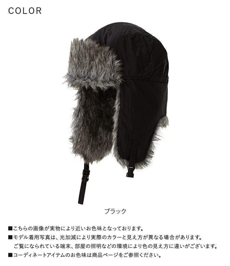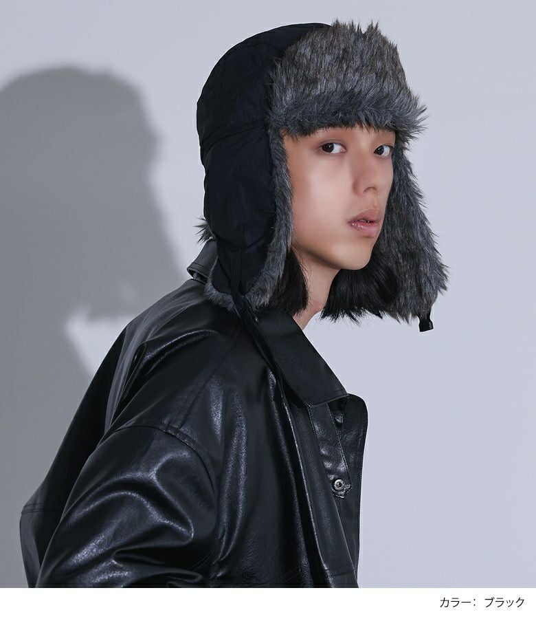 ファーの耳当てとつばがポイントのフライトキャップ。