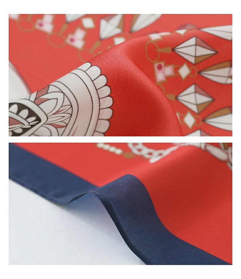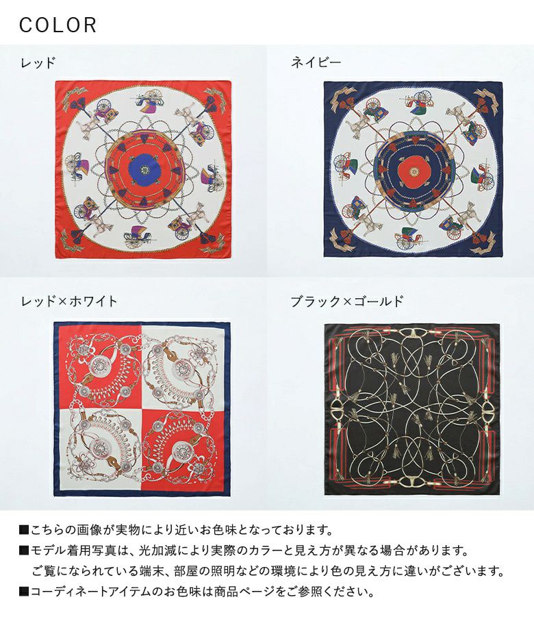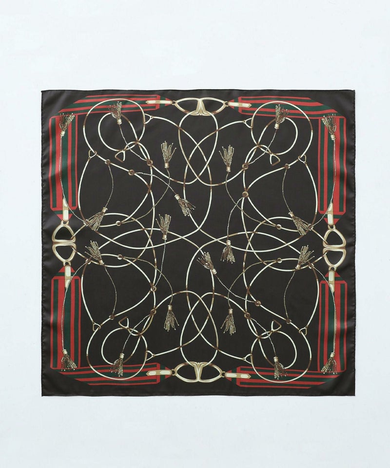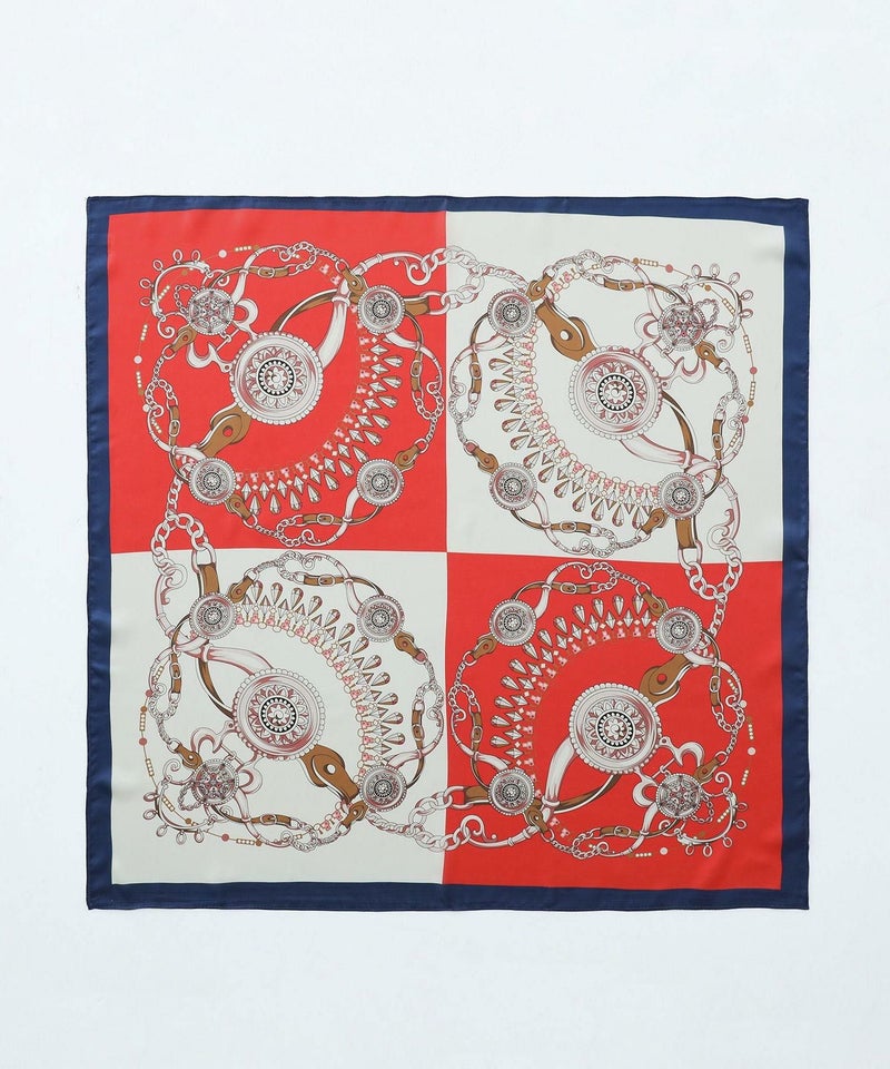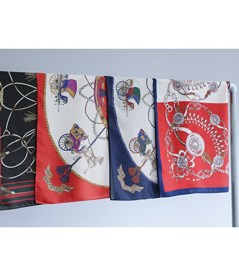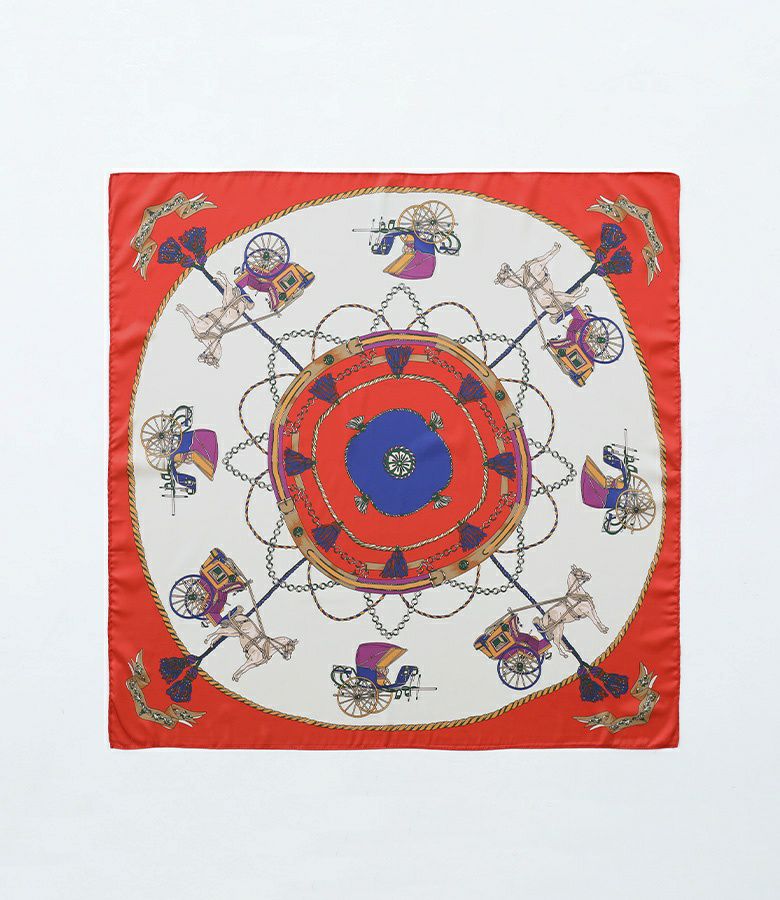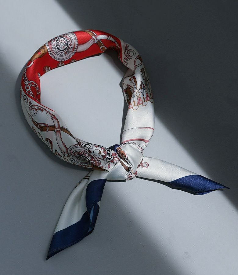 艶と光沢のある滑らかな素材に色鮮やかなプリントを載せたスカーフ。頭や首に巻いて使用するのはもちろん、バッグにつけてもコーデのアクセントになるアイテムです。