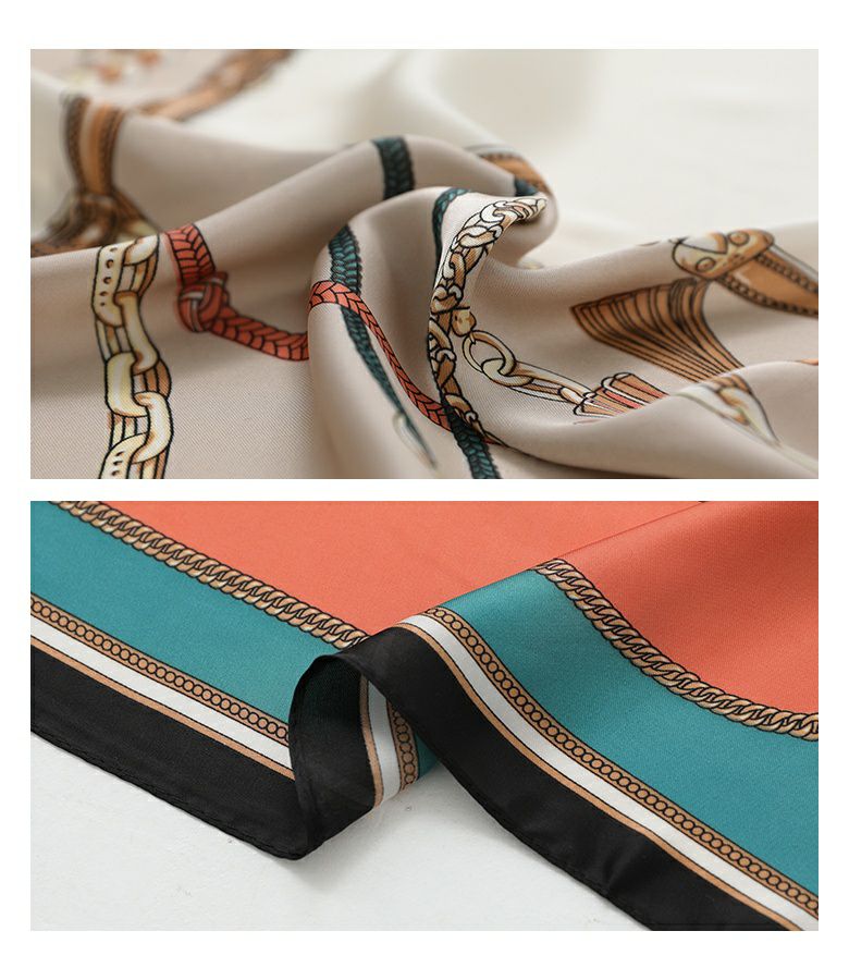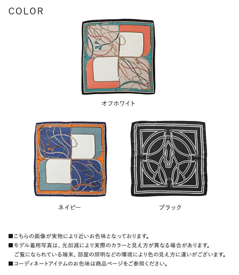 艶と光沢のある滑らかな素材に色鮮やかなプリントを載せたスカーフ。頭や首に巻いて使用するのはもちろん、バッグにつけてもコーデのアクセントになるアイテムです。
