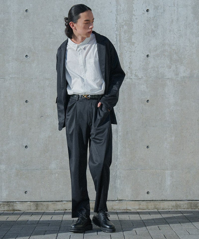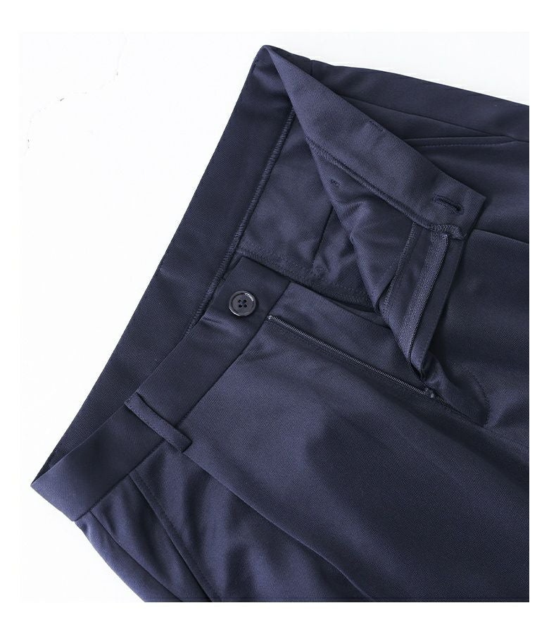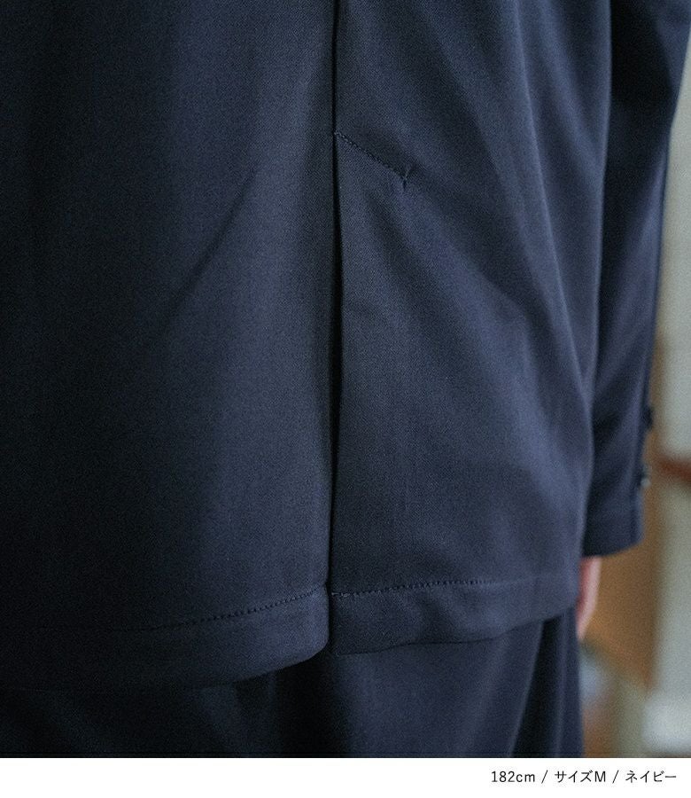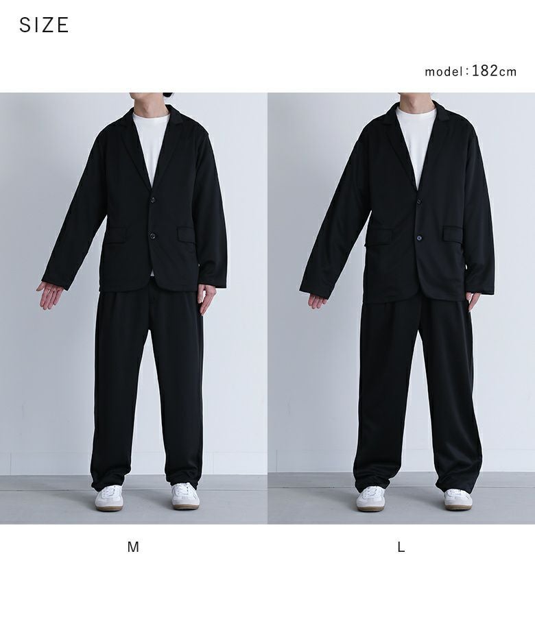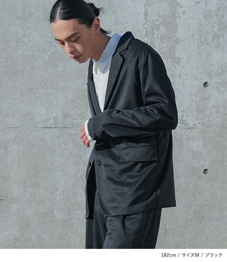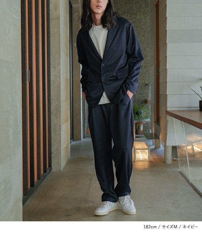 ジャージー生地を使用したセットアップは、ストレッチが効いて動きやすく、着回しのきくデザイン。背抜きのジャケットは季節の変わり目に羽織りやすく、フラップポケットがアクセントになります。パンツは前後4ポケット付きで機能性も兼ね備え、上下単品でも着回しが出来る汎用性の高いアイテムです。