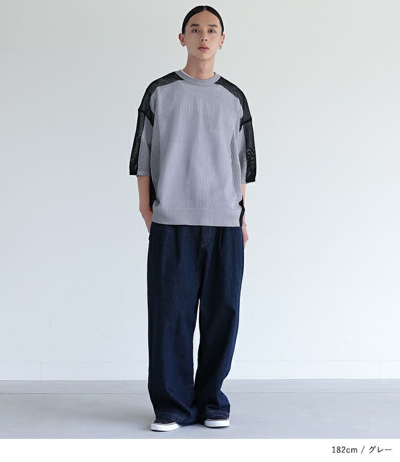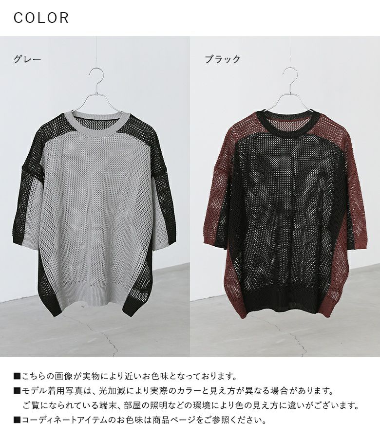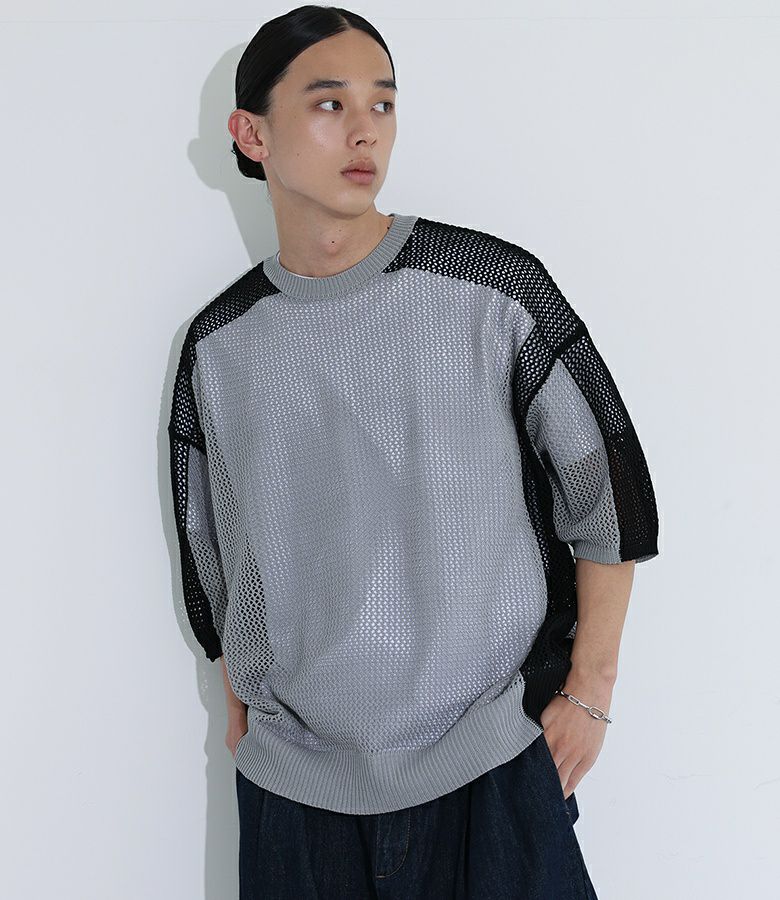 肩と脇に入った配色デザインがポイントのメッシュニットトップス。ラフに着られるゆるっとシルエットでレイヤードコーデを楽しめる優秀アイテムです。
