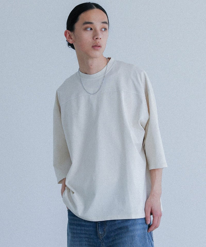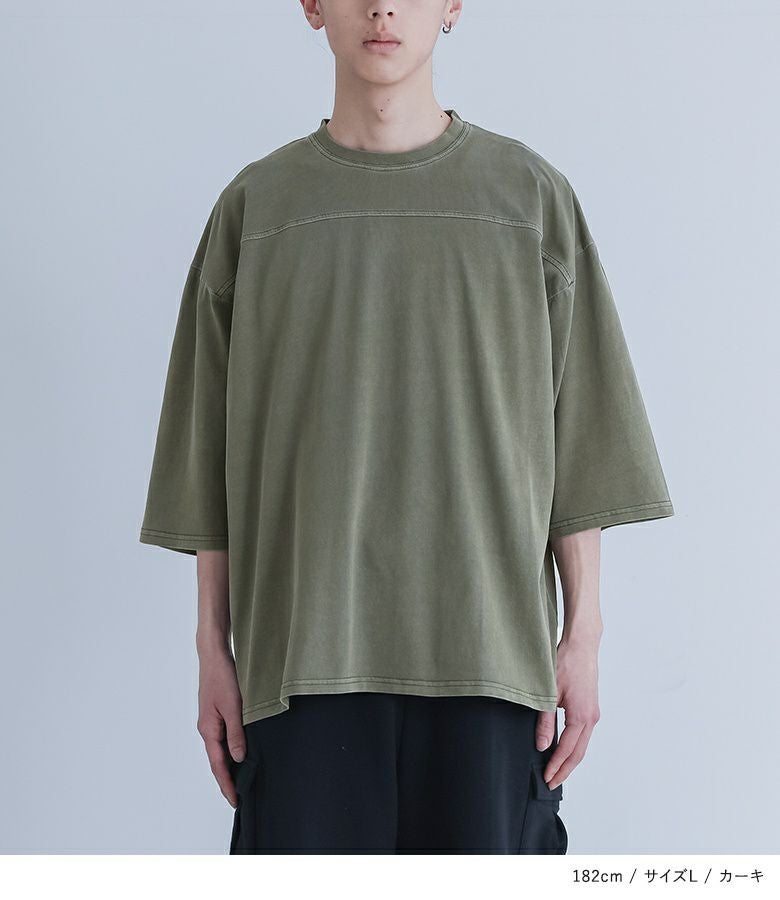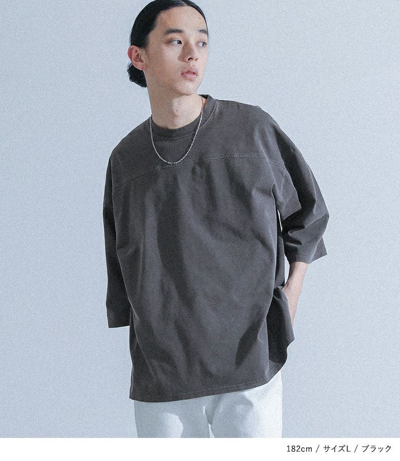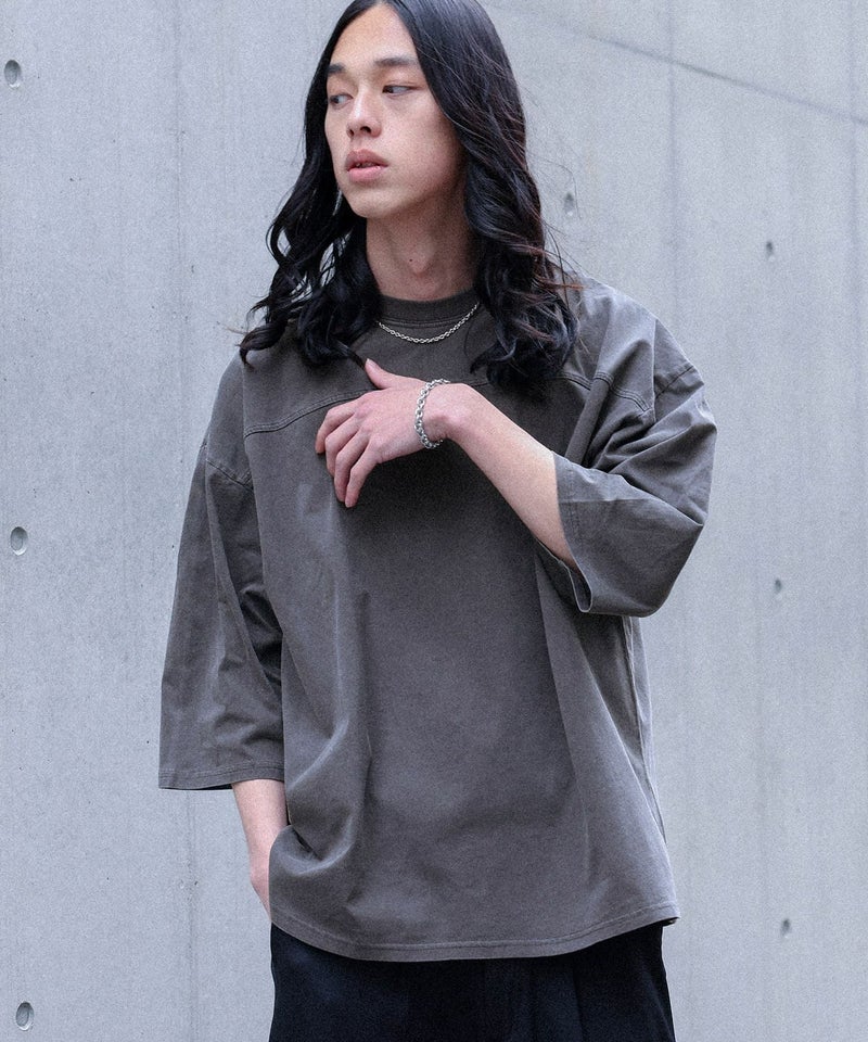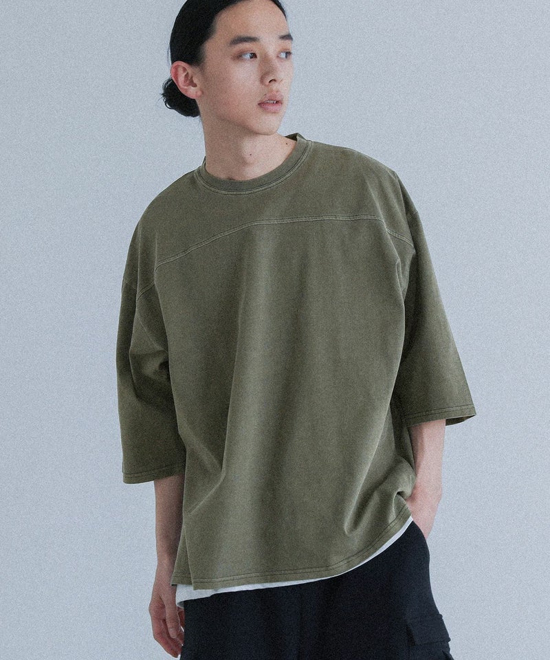 ヴィンテージ感のあるピグメント加工が施されたカットソートップス。生地のアタリを楽しめる身頃の切り替えデザインが特徴。シンプルで着回しやすく、ラフに着られるゆったりとしたシルエットで、首回りがすっきりと見えるクルーネックデザインです。
