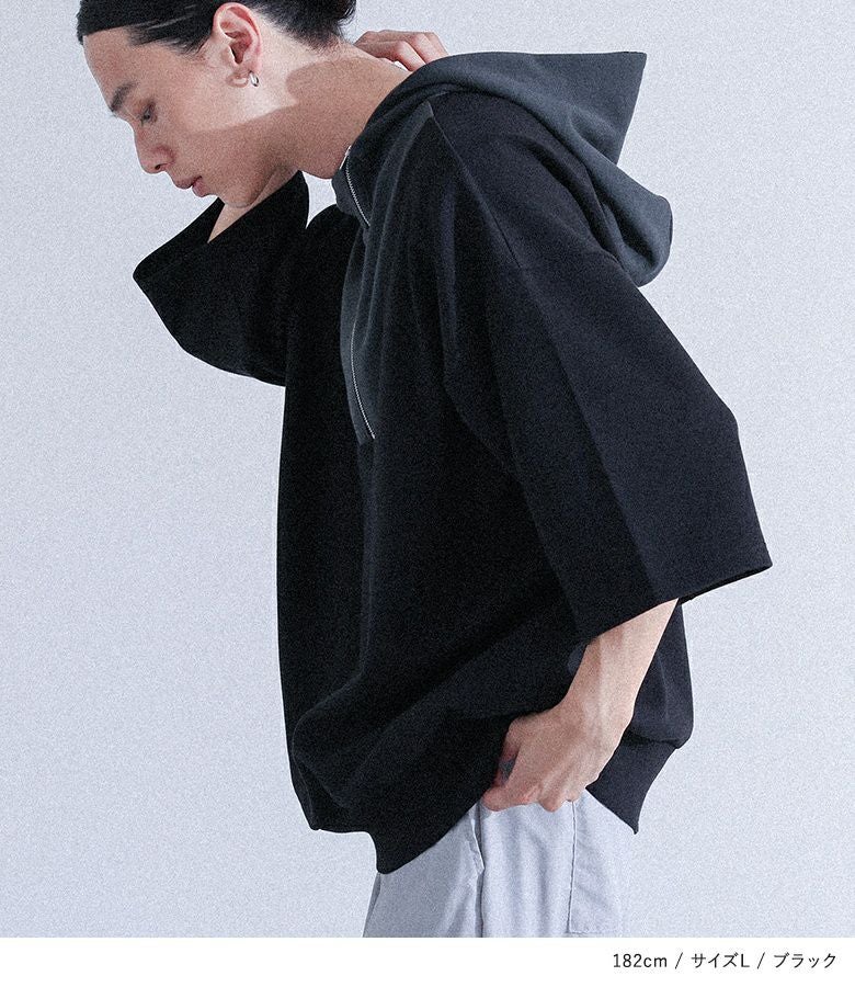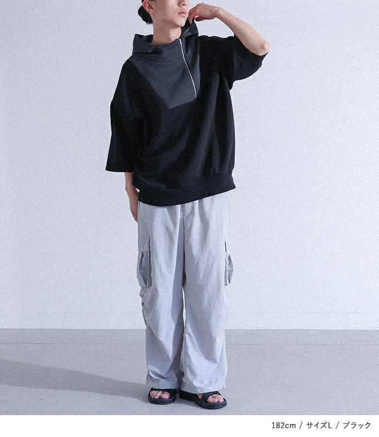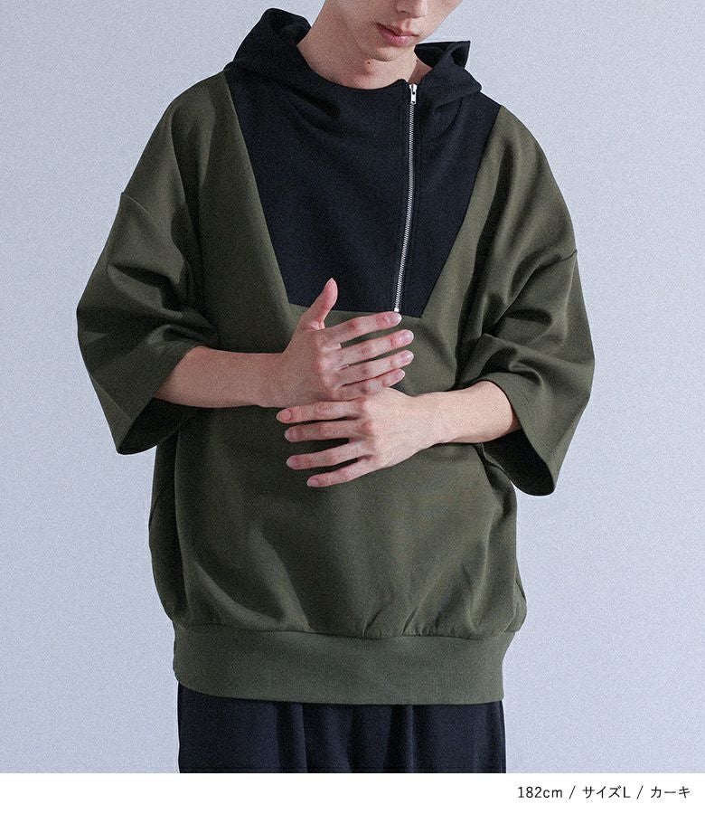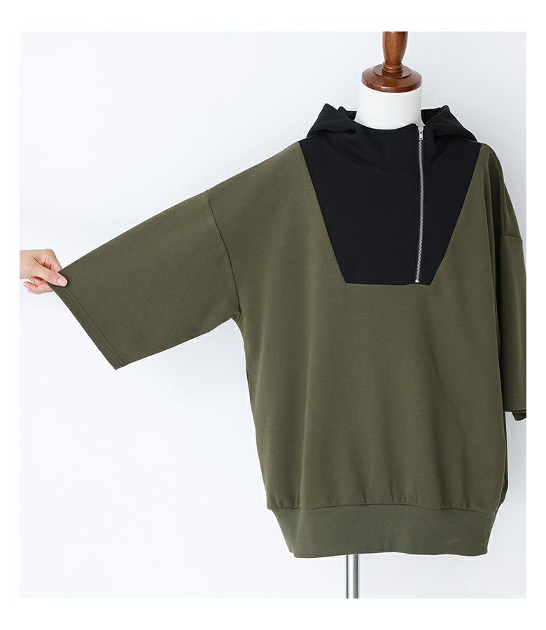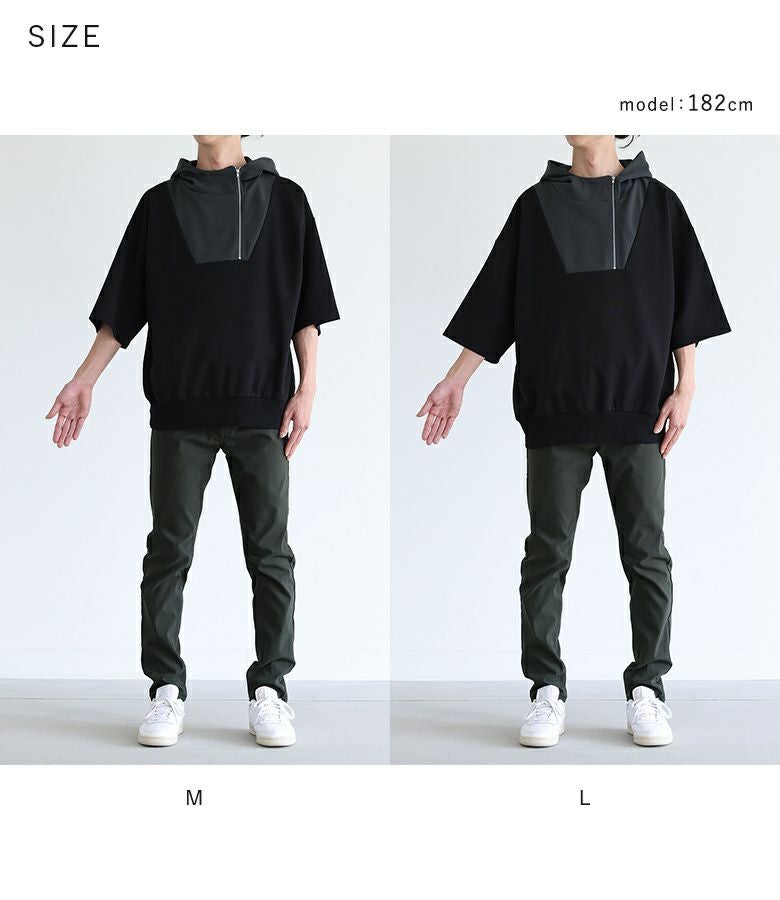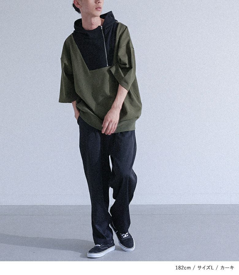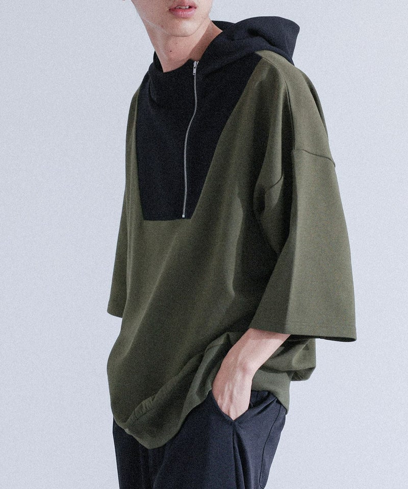 配色切り替えが目を惹くポンチフーディー。スタンドフードとファスナーが個性的なデザインで、裾はリブでしっかりフィットします。肘まで隠れる袖丈と、ラフに着られるゆるっとしたサイズ感で、快適ながらもスタイリッシュな着こなしが叶う一枚です。