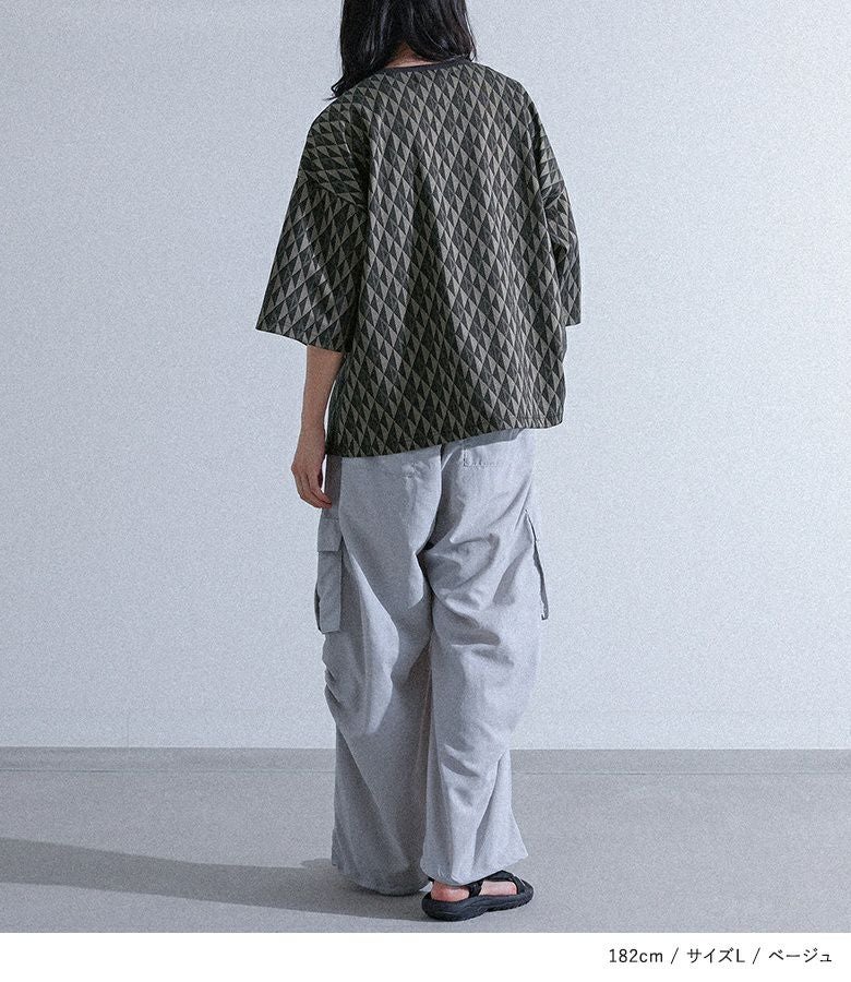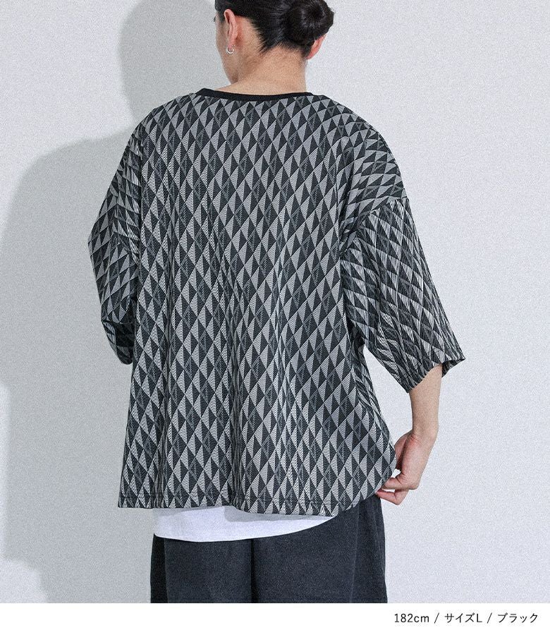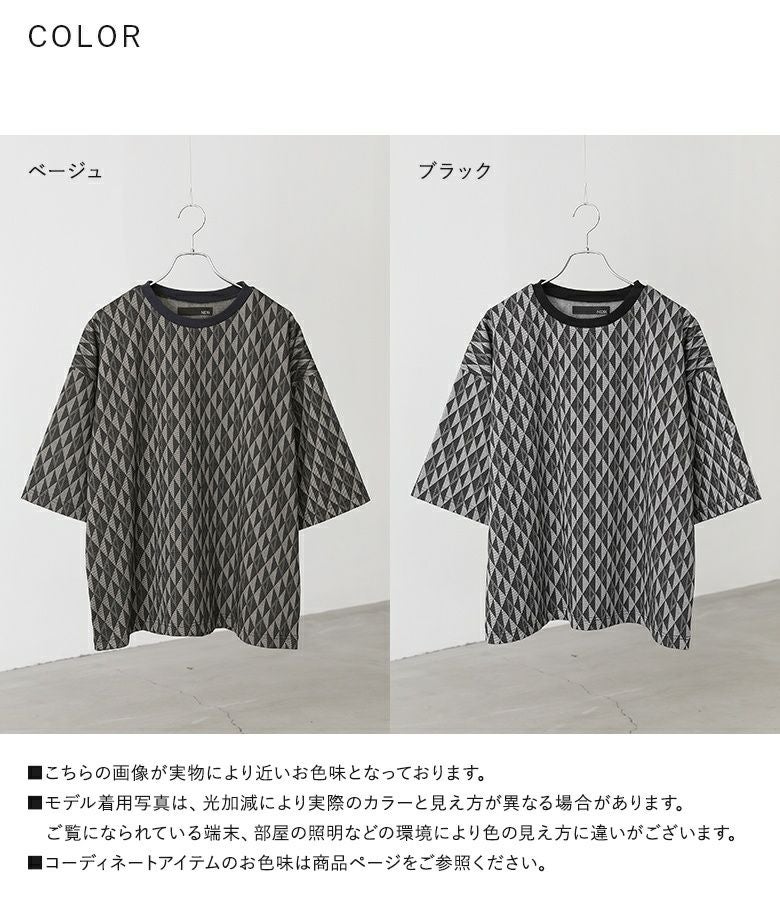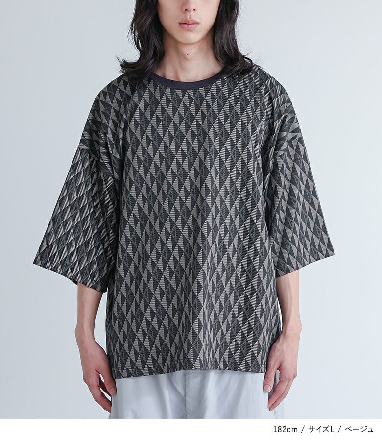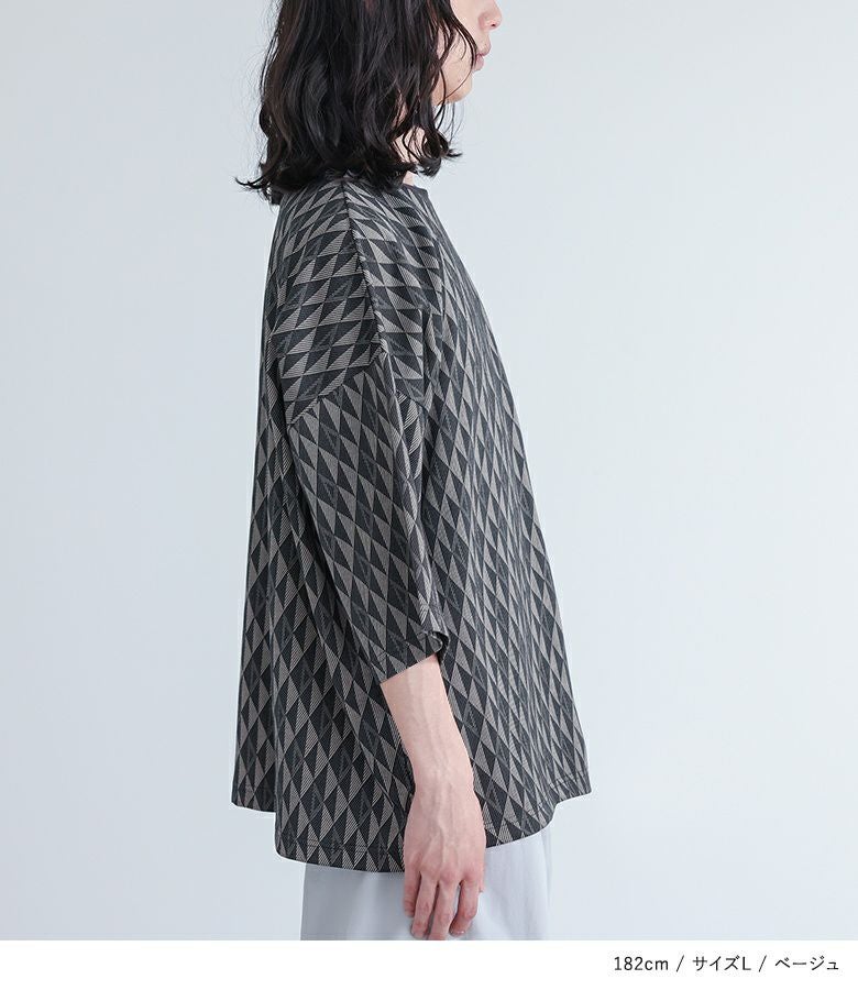 配色の幾何学模様生地を使用した、シンプルながらも存在感のあるカットソー。襟は締め色のリブ切り替えでアクセントに。ストレッチの効いた動きやすい生地感で、ラフに着られるゆったりシルエットです。快適な着心地と着まわしやすいシルエットは、カジュアルな日常使いから、ちょっとしたお出かけまで、あらゆるシーンに対応します。