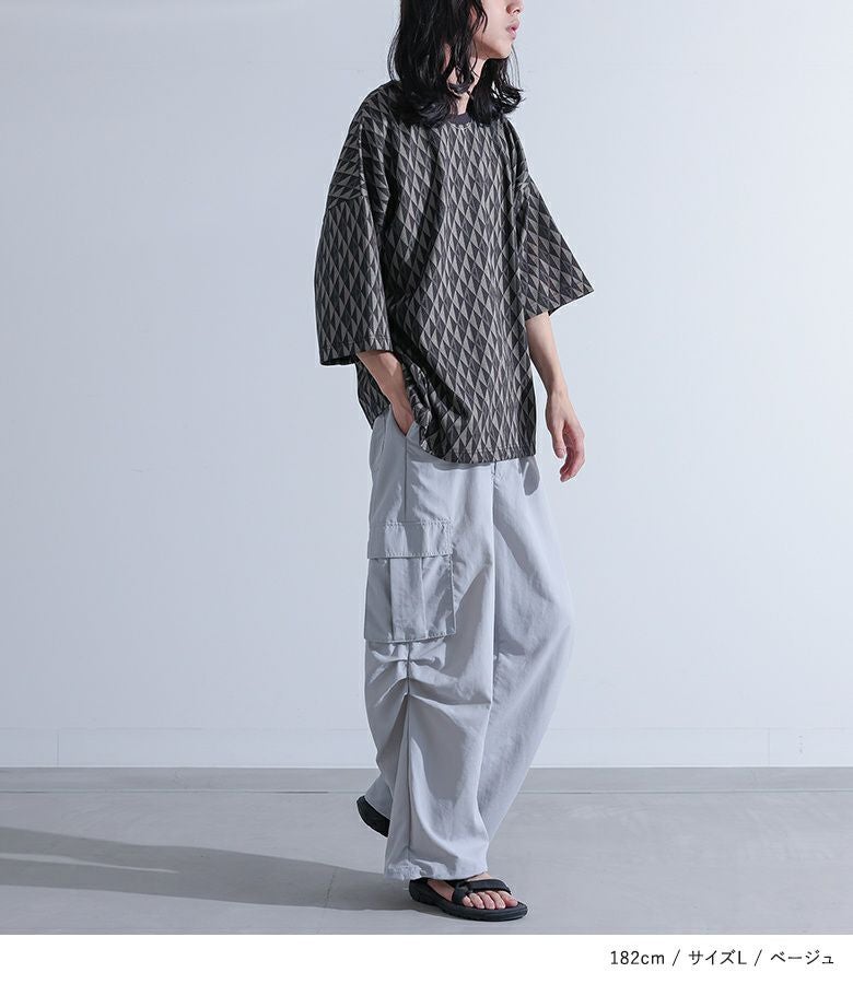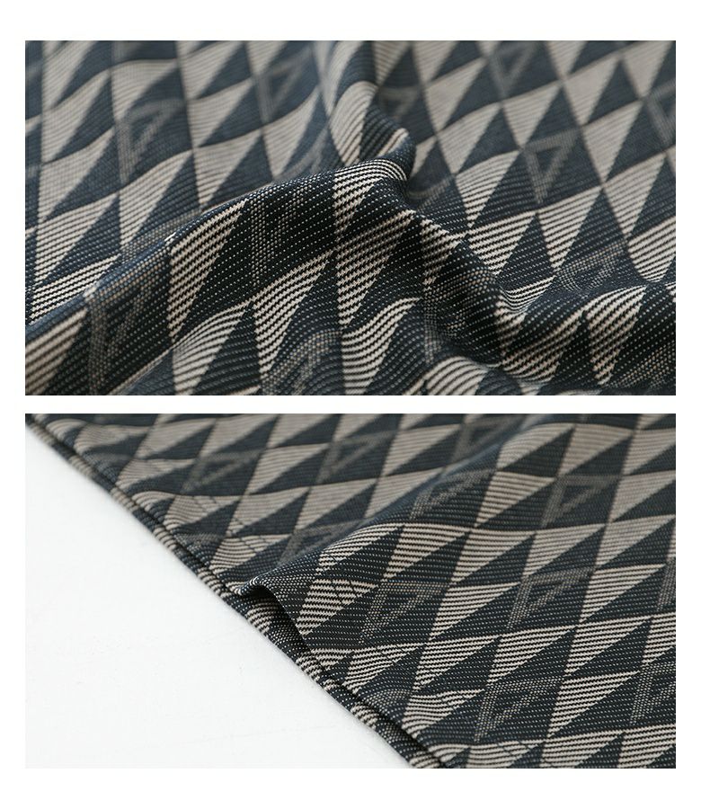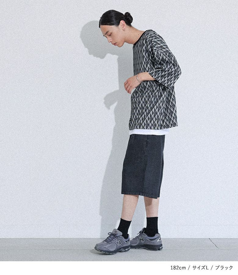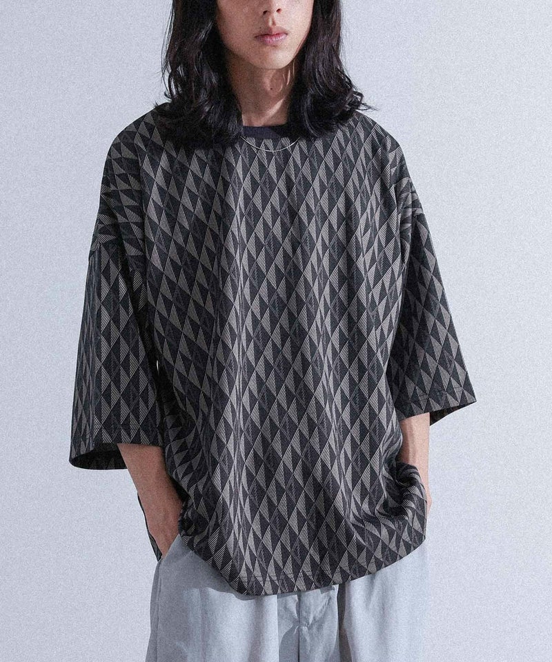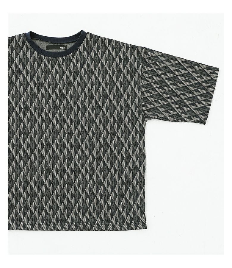 配色の幾何学模様生地を使用した、シンプルながらも存在感のあるカットソー。襟は締め色のリブ切り替えでアクセントに。ストレッチの効いた動きやすい生地感で、ラフに着られるゆったりシルエットです。快適な着心地と着まわしやすいシルエットは、カジュアルな日常使いから、ちょっとしたお出かけまで、あらゆるシーンに対応します。
