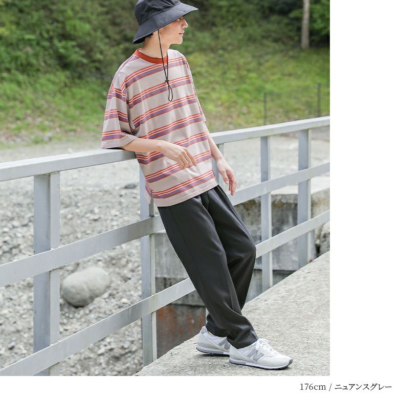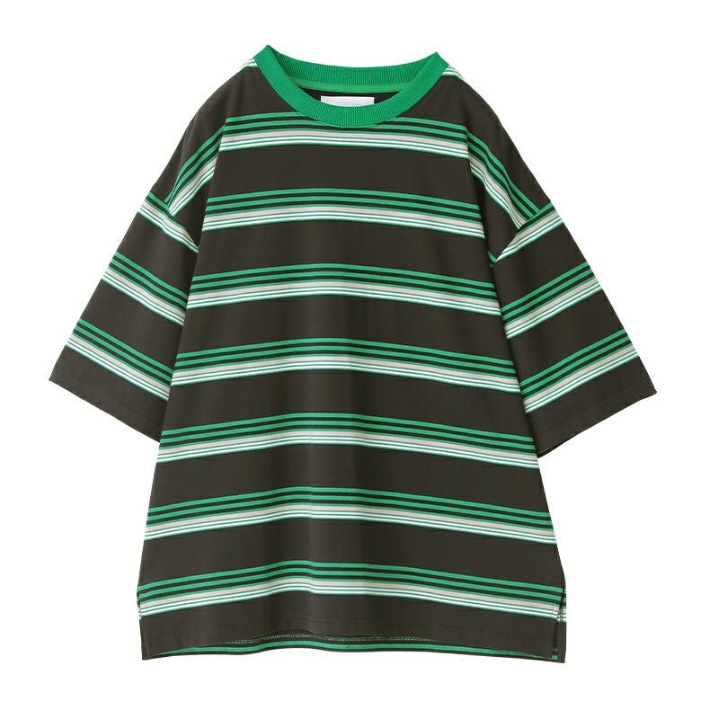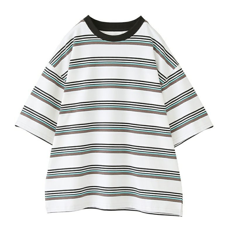 センス高まる4色でデザインした、ランダムなピッチのボーダーTシャツ。ゆるっと着られるオーバーサイズシルエットに、襟ぐりの配色リブ仕様がアクセント。