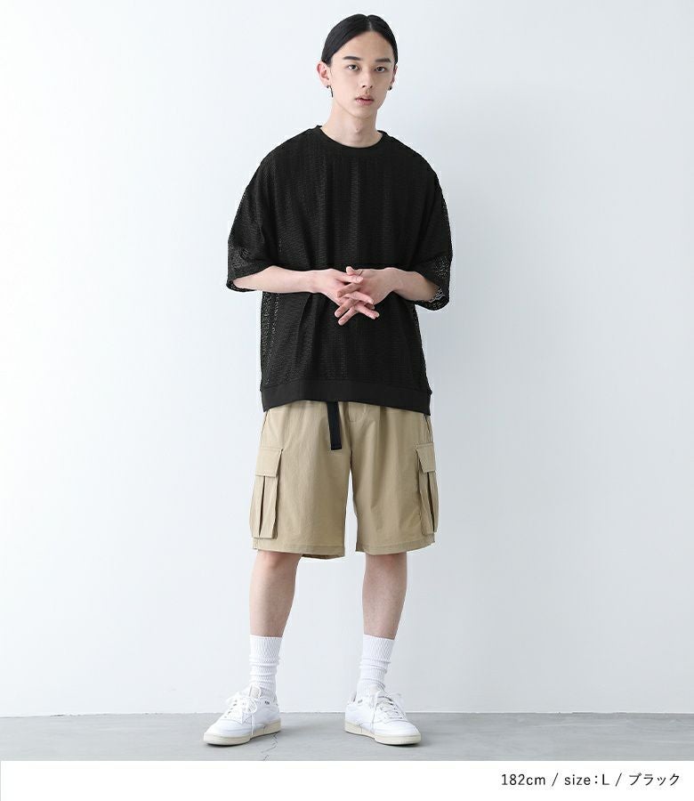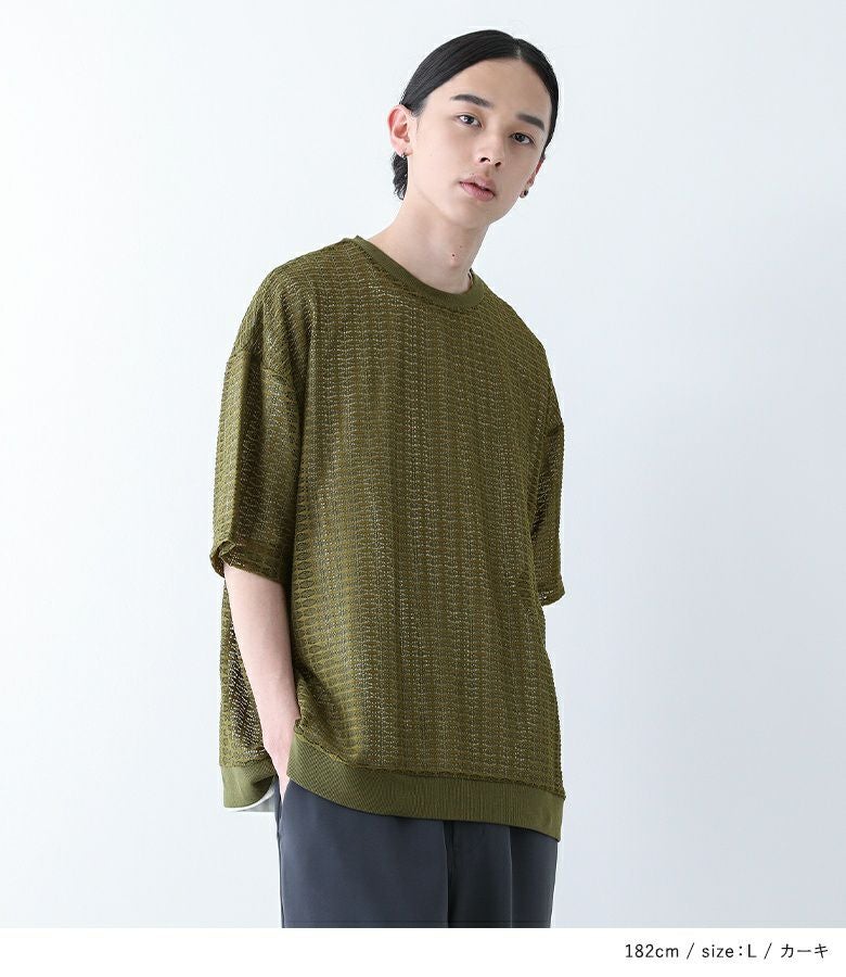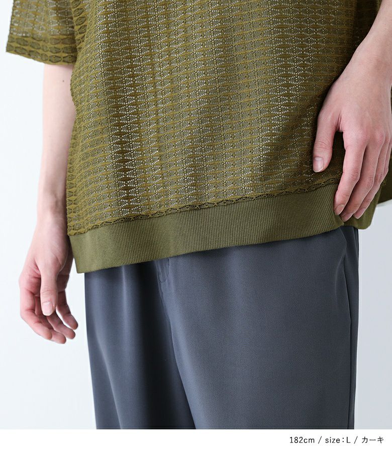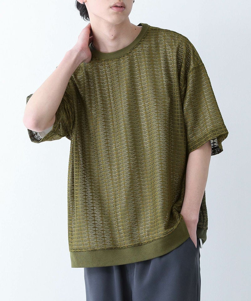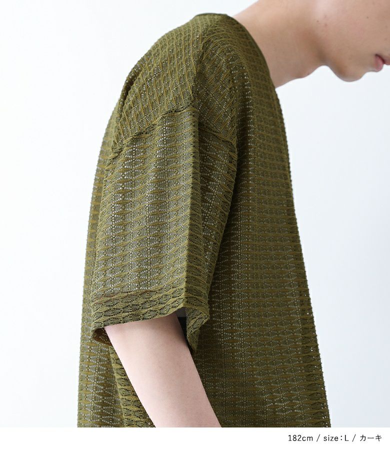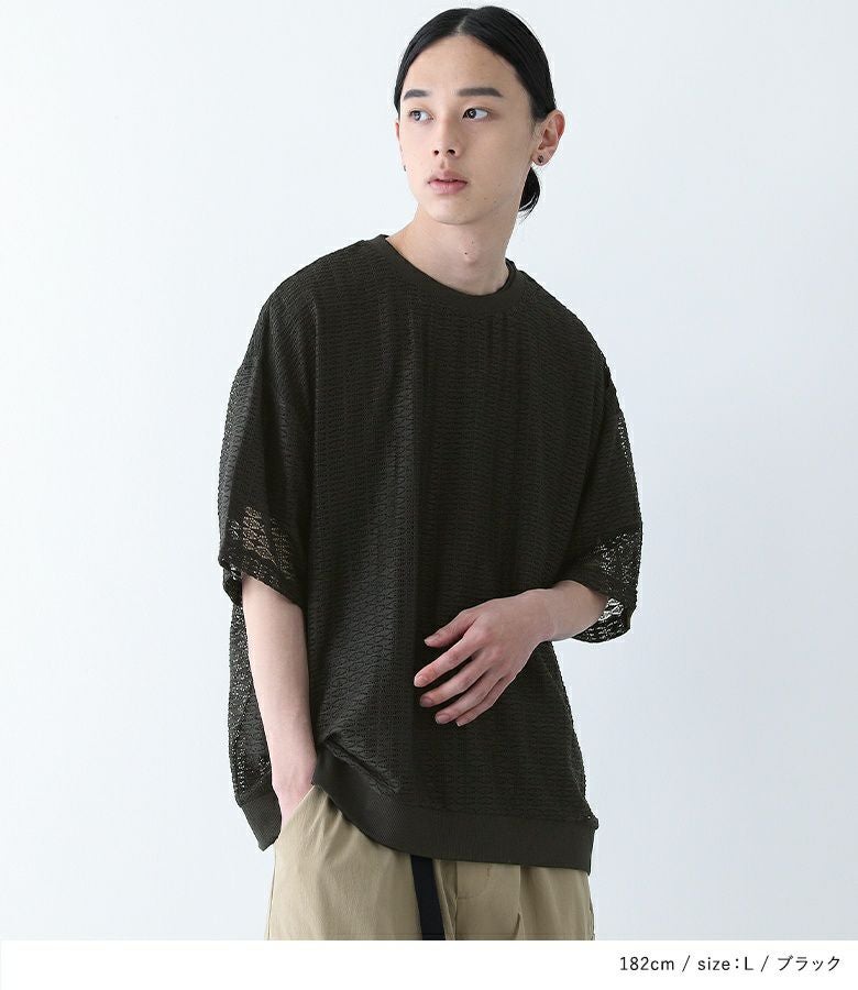 透け感のあるレース生地を使用したトップス。襟と裾はリブ切り替えで、メリハリのあるデザインにしています。レイヤードしやすいオーバーサイズシルエットで着やすさも◎