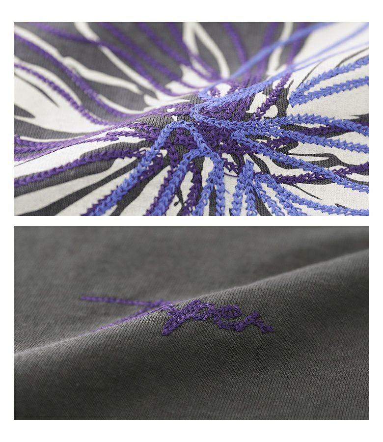 フロントにはポイントになる刺繍、バックには花柄のプリントの上に大胆な刺繍を施したデザインTシャツ。立体感と配色感でTシャツスタイルに差をつけます。ゆるっとしたシルエットでこなれ感もプラス。