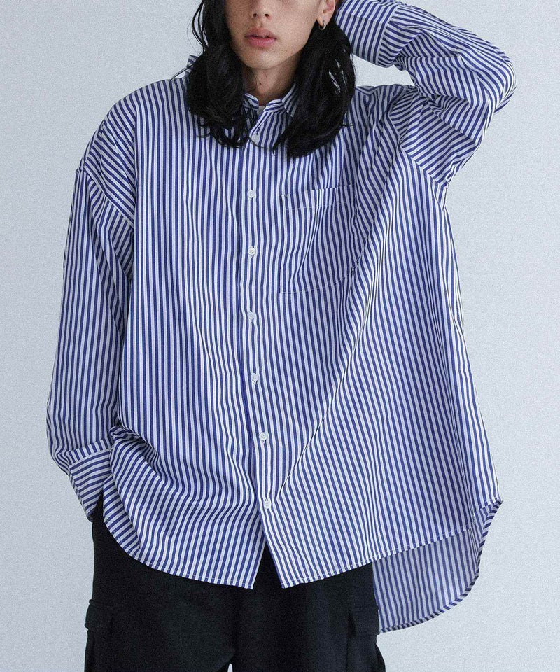 太めのストライプ柄が、カジュアルな印象を惹き立てるロングシャツ。Tシャツの上にも羽織りやすいビッグシルエットでラフに着ていただけます。