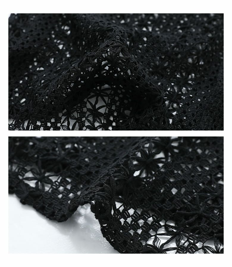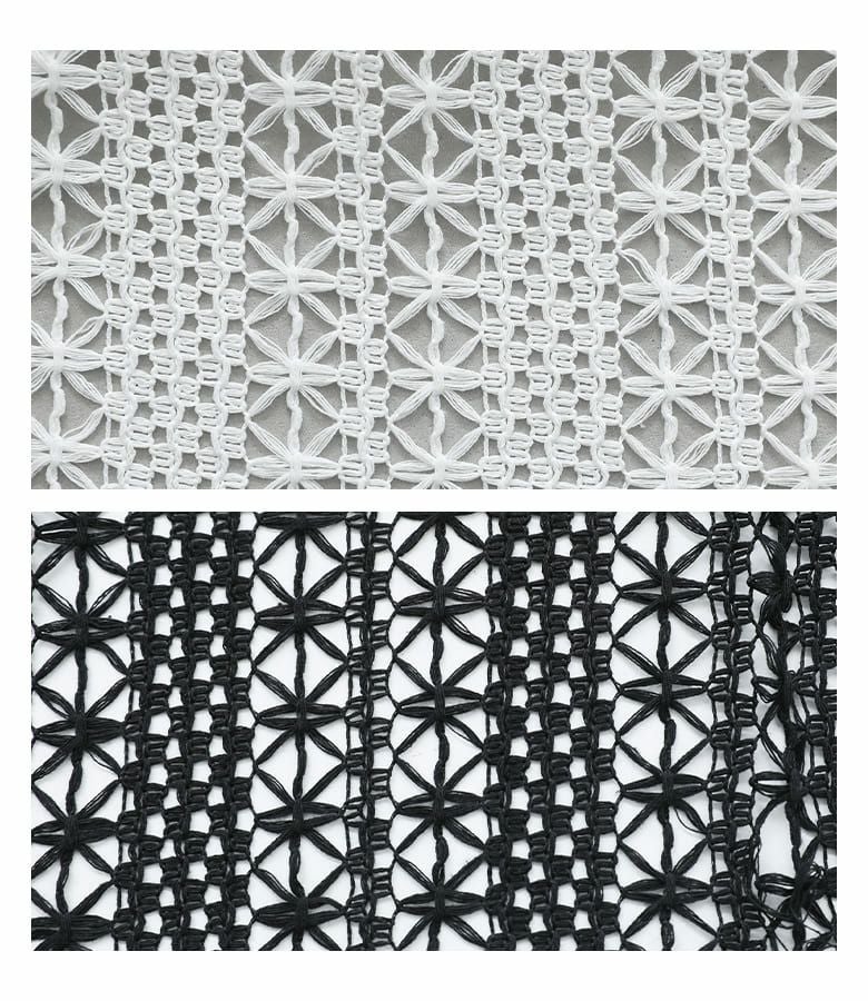 程よいハリ感のあるコットン混素材を使用。透け感のある柄編みが涼しげな印象を与え、快適な着心地を叶えます。