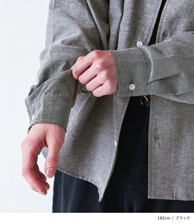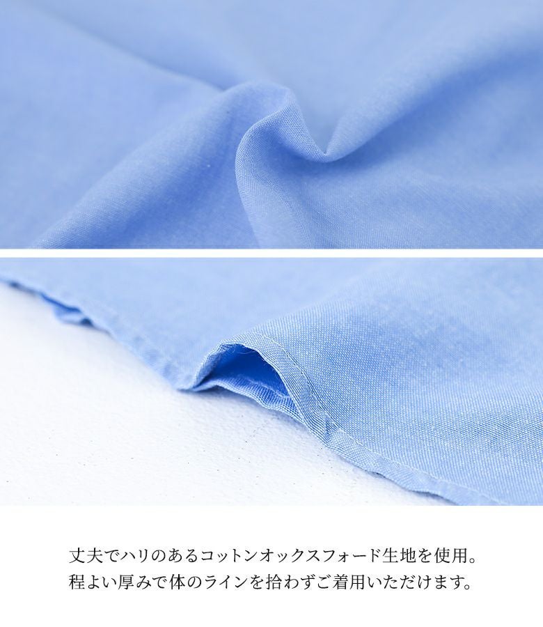 丈夫でハリのあるコットンオックスフォード生地を使用。程よい厚みで体のラインを拾わずご着用いただけます。