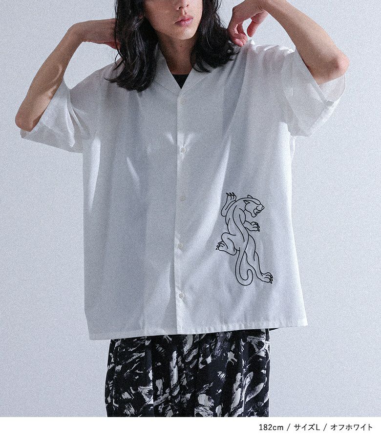 大きく存在感のあるパンサーの刺繍デザインがポイントのシャツ。首元をすっきりと見せるオープンカラーで、ワイドシルエットで羽織にも使いやすいサイズ感です。
