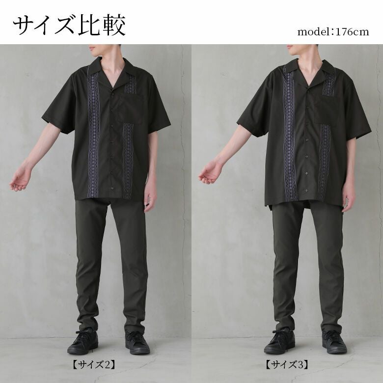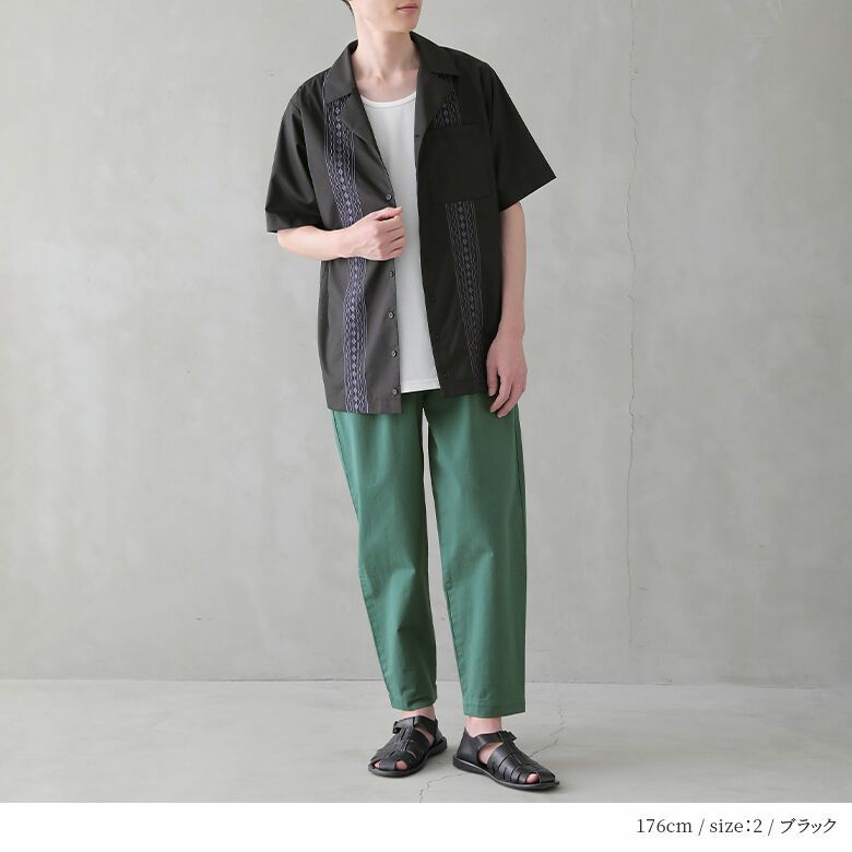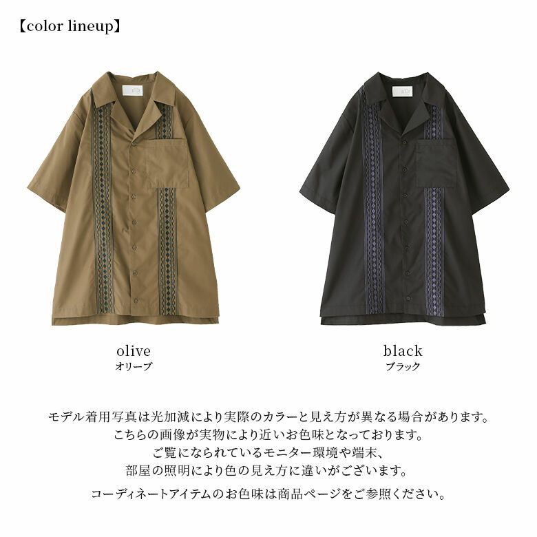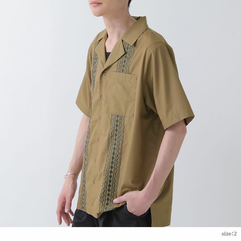 複数のモチーフを組み合わせた、オリジナルの幾何学柄の刺繍がアクセントになった開襟シャツ。ゆったりしたオーバーサイズでこなれて見える一枚です。