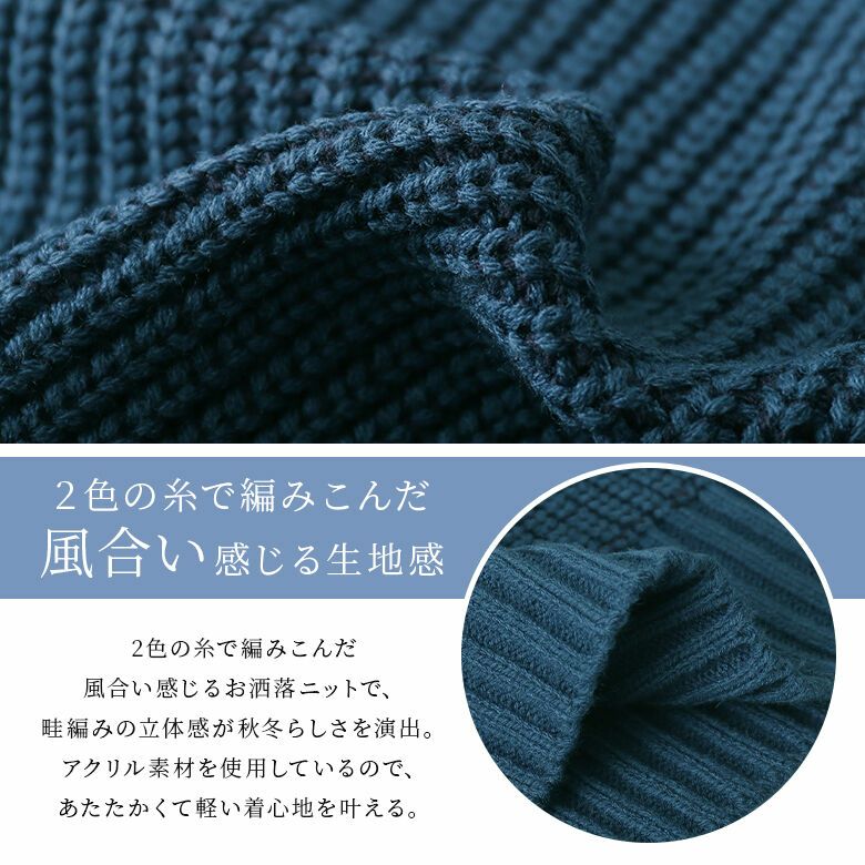 2色の糸で編み込んだ立体感のある畦編み生地は、独特なニュアンスがあり、暖かくて軽い着心地を叶えてくれる。2サイズ展開からお好きなシルエットをお選びください。