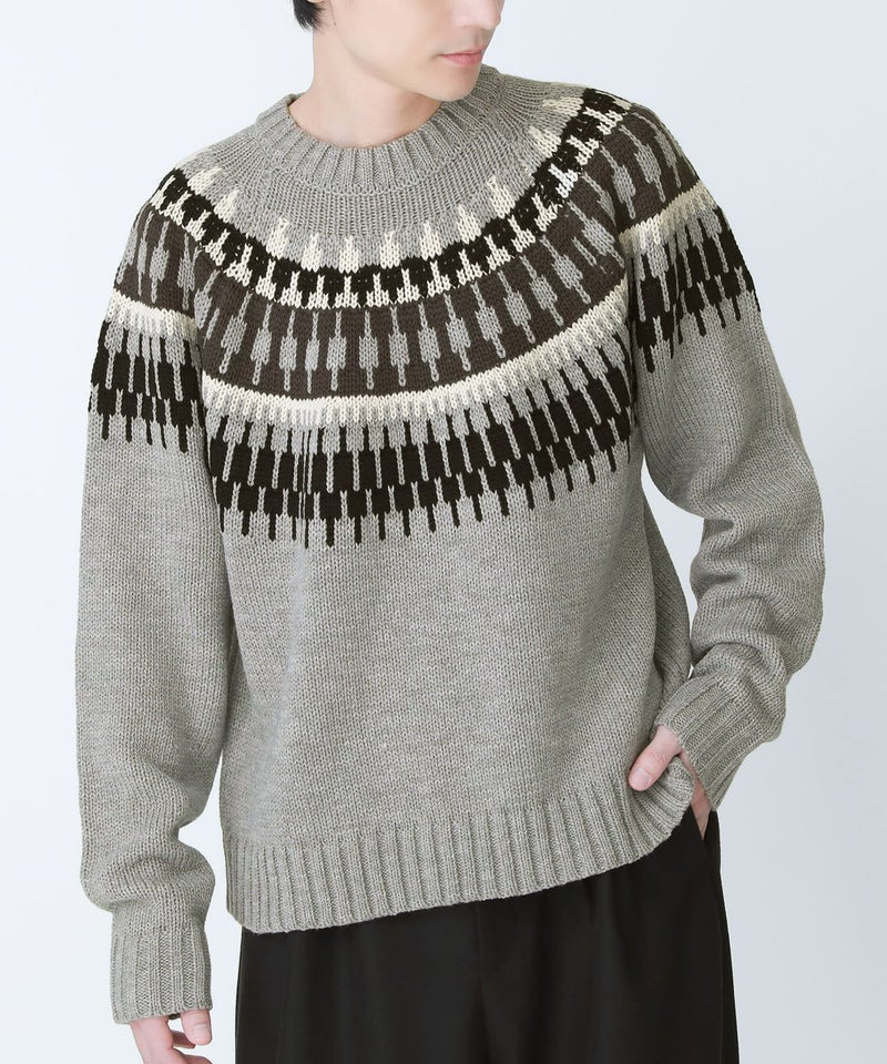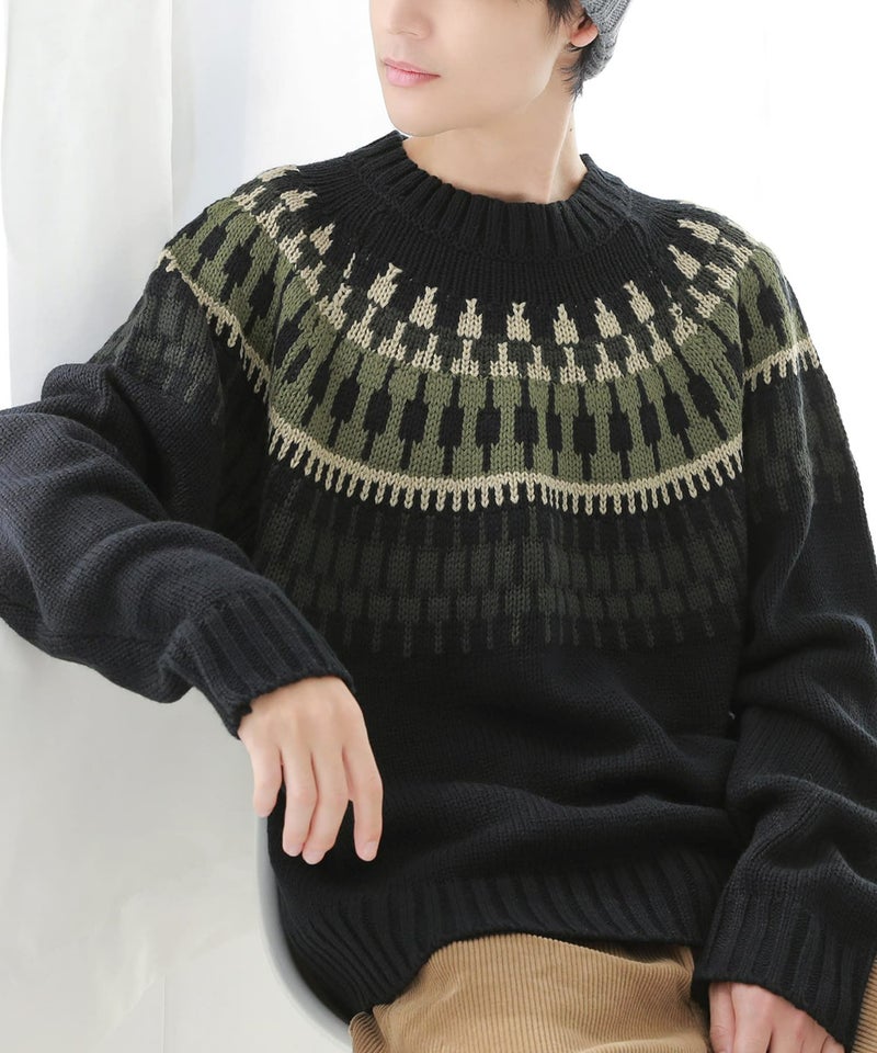着るだけでコーデのポイントになる、ゆるっとラフなノルディック柄ニット。太めのリブがカジュアルな印象を惹き立てる優秀な一着です。