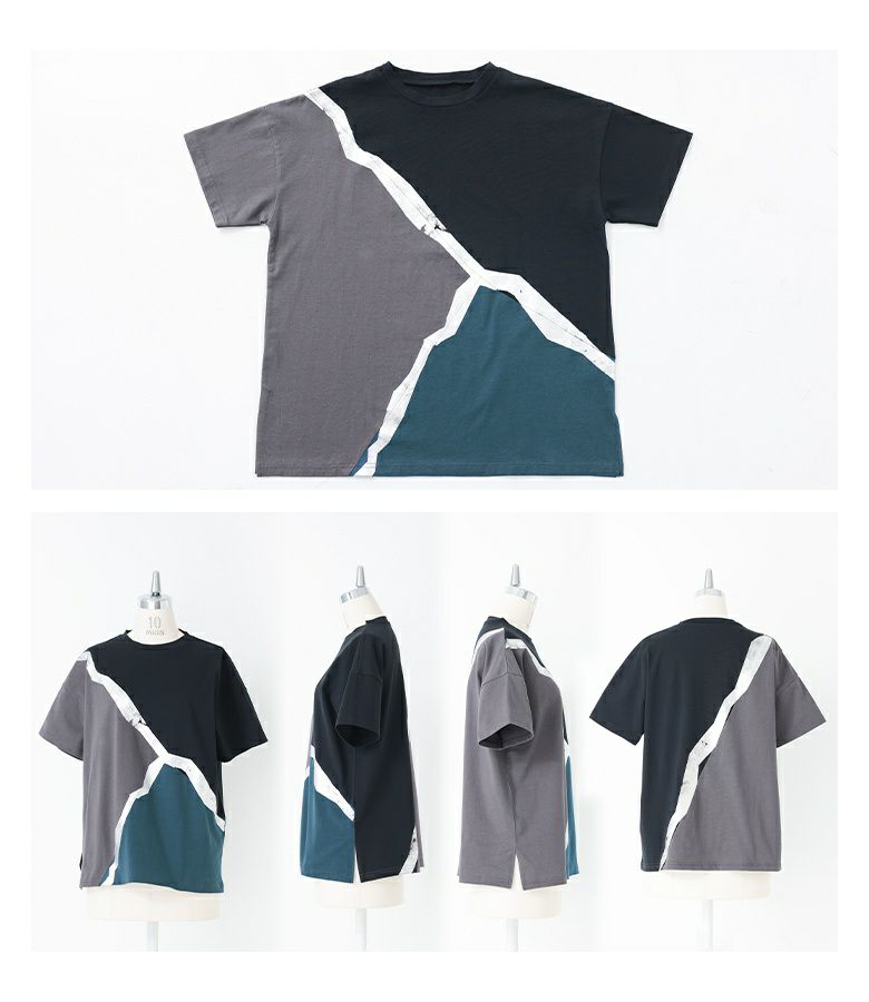 3色の切り替えデザインの上に、ランダムなラインのシルバー箔プリントを施したデザインTシャツ。箔プリントのラインをあえて掠れさせることで、こなれた印象をプラス。前身頃は個性的でありながらも着やすく、後ろ身頃は斜めの2色切り替えで、フロントとは異なるモダンな雰囲気を演出します。印象的な箔ラインと前後で異なる配色が、お洒落なアクセントを加えます。