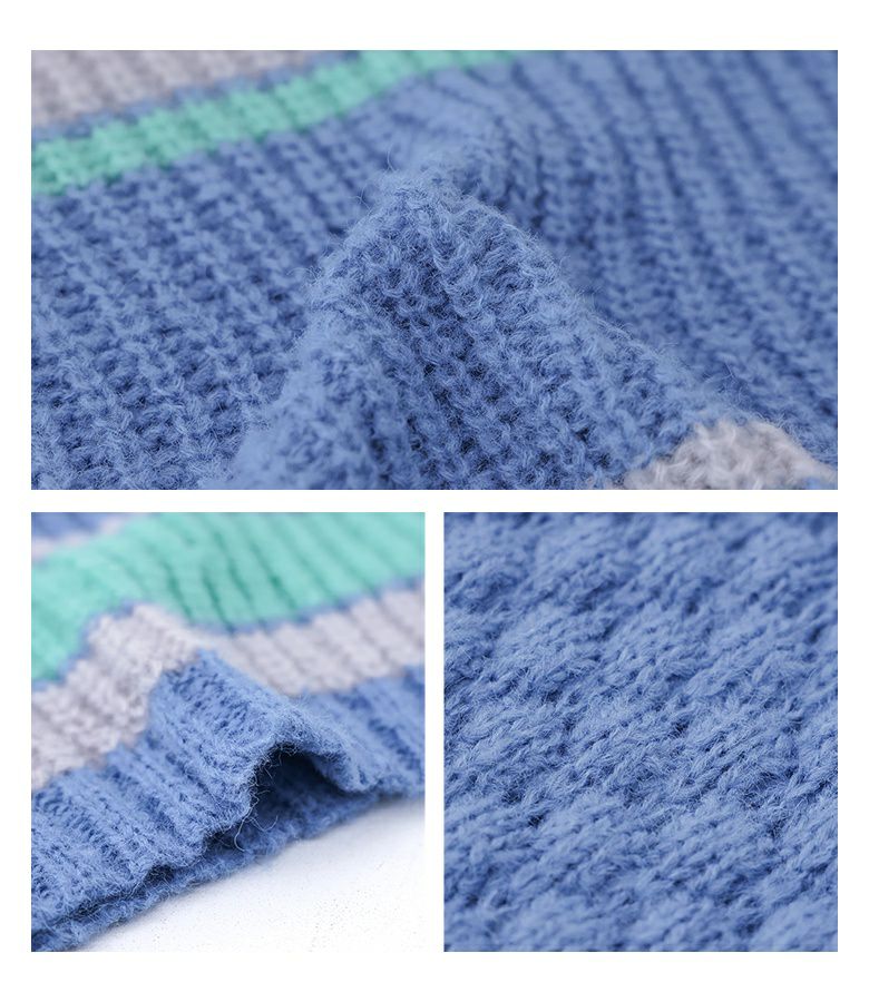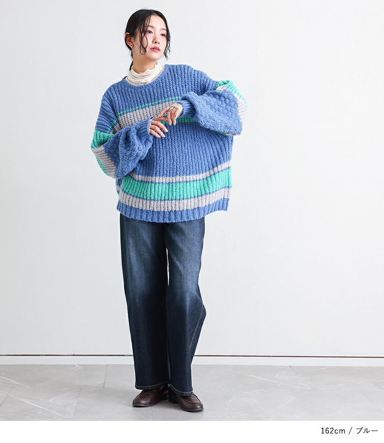 配色が目を惹くマルチボーダー柄のローゲージニットトップス。ざっくりとした編み地に、袖部分だけ異なる編地を使用し、ポコポコとした立体感でおしゃれなアクセントをプラスしています。ボリュームのある袖シルエットが程よい抜け感を演出し、シンプルな形ながらもこなれた印象に。大人も着やすいすっきりとした首周りのデザインです。