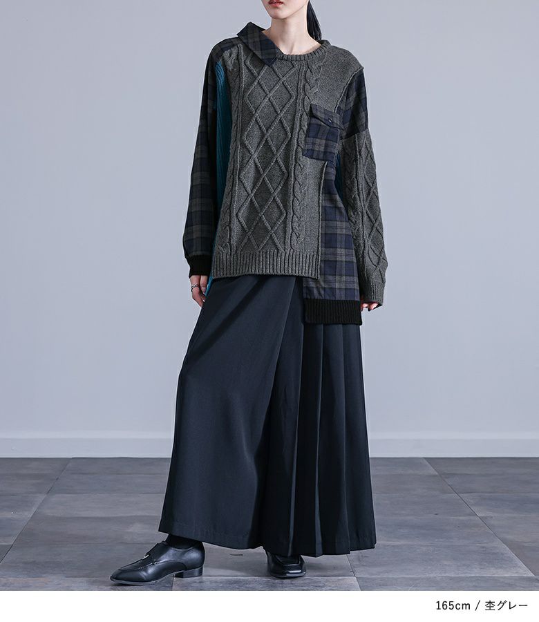 ニット3色とチェックの布帛生地をドッキングしたニットトップス。ニットの編地は、ケーブル編み、畔編み、天竺編みの3種類で印象的なデザインに仕立てました。胸ポケットや裾のアシンメトリーデザインや袖口までこだわった周りと差のつく一着に。