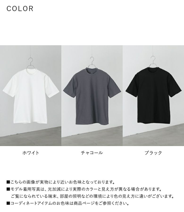 シンプルなデザインなので様々なボトムスに合わせていただけます。デニムと合わせてカジュアルに、シンプルなテーパードパンツと合わせて綺麗めな印象に。程よくゆるっと着られるサイズ感でアウターに響きにくいため、ジャケットと合わせてビジネスシーンや綺麗めなカジュアルスタイルにも最適です。インナーとしてはもちろん、一枚で着用してもだらしなく見えないサイズ感で、日常の着回しに頼れる一着です。