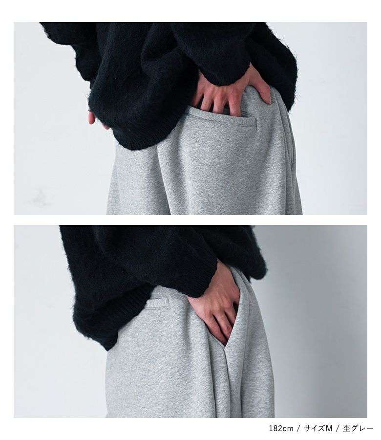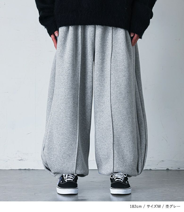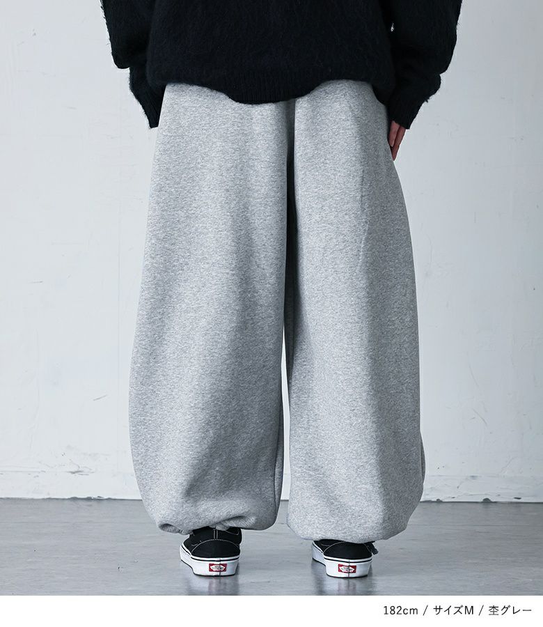 しっかりとした厚みのある裏起毛生地を使用したワイドパンツ。サイドにタックが入ったバルーンシルエットで裾は紐で絞ってシルエットを変えられる仕様です。ウエストは総ゴムで着脱しやすく、ひも付きでサイズ調整も可能。サイドとバックにポケットが付いているので機能性も兼ね備えたデザインです。
