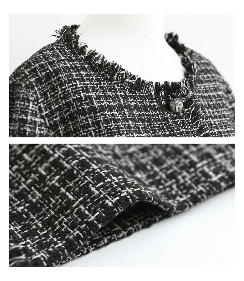 モノトーンでまとめた上品な印象のツイードジャケット。フリンジ使いとヴィンテージ感のあるボタンがアクセントになったデザイン。長め丈のボックスシルエットで旬な着こなしが叶う、セレモニーなど特別なシーンにも着用できるアイテムです。