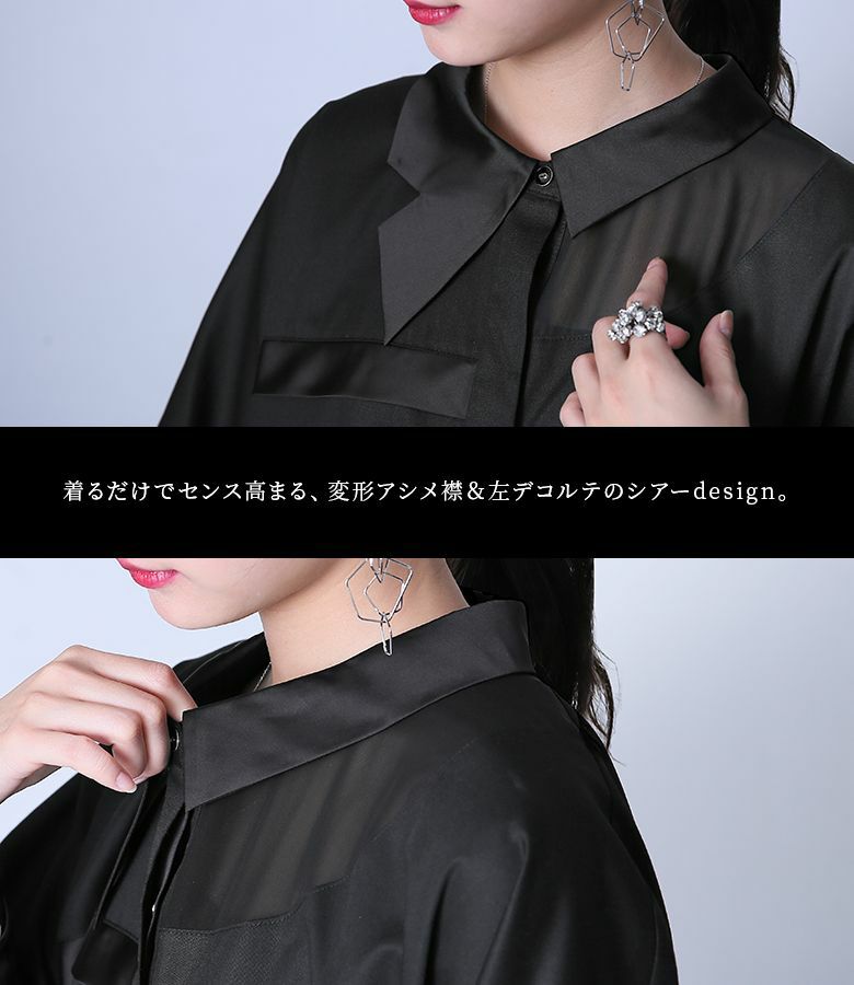 上質なサテン生地で仕立てたワンピースに、ドルマンシルエットでゆるっとこなれ感もプラス。変形デザインがお洒落な襟元は、左デコルテ部分にシアーなジョーゼット生地を使用した異素材仕立てです。