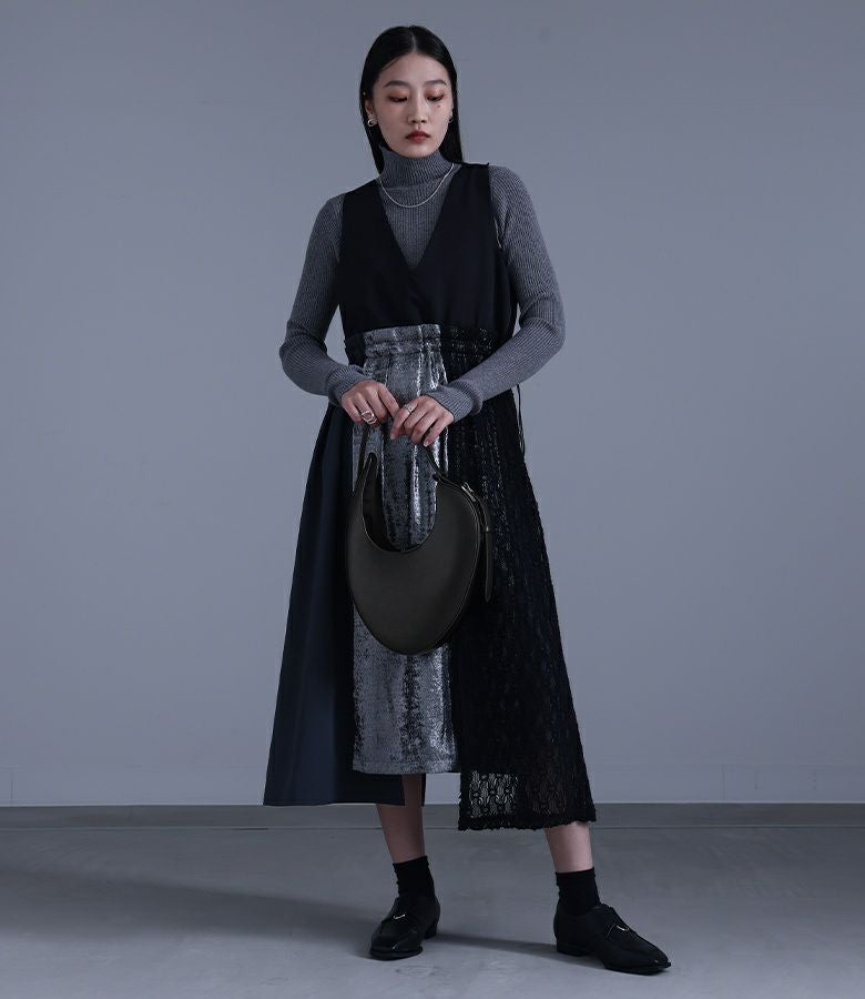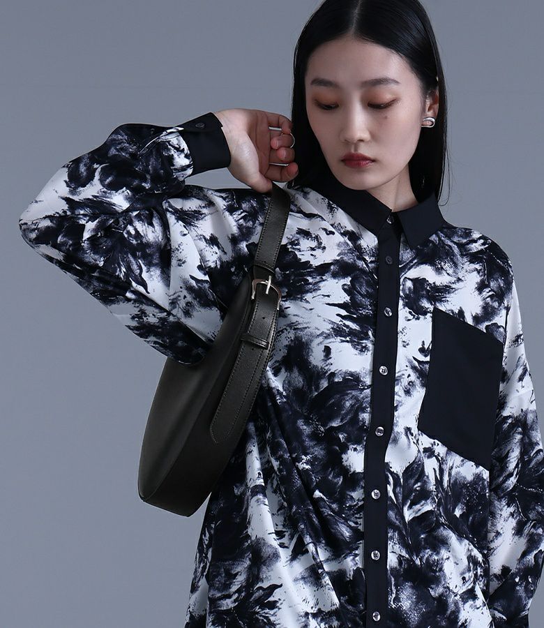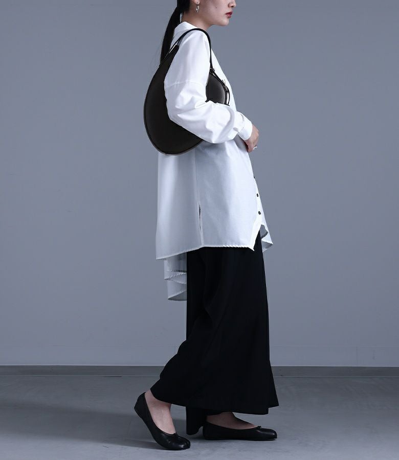 シンプルなスタイルに合わせるだけでモードな雰囲気に導くデザインアイテム。無地や柄物・デザイン物とも相性が良く、シンプルながら個性的な印象に仕立てます。