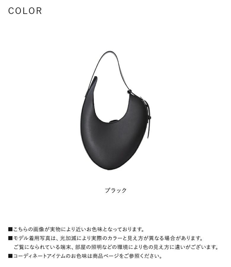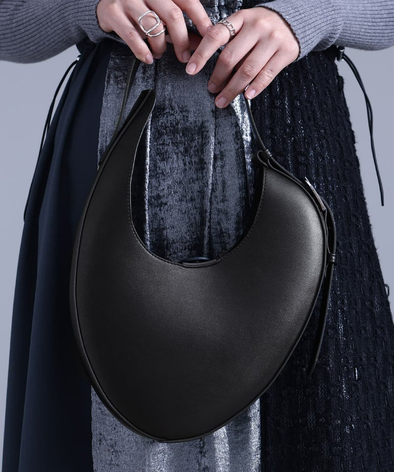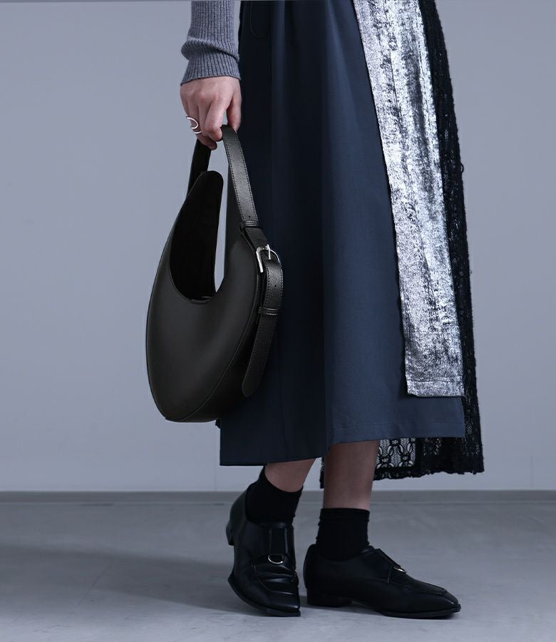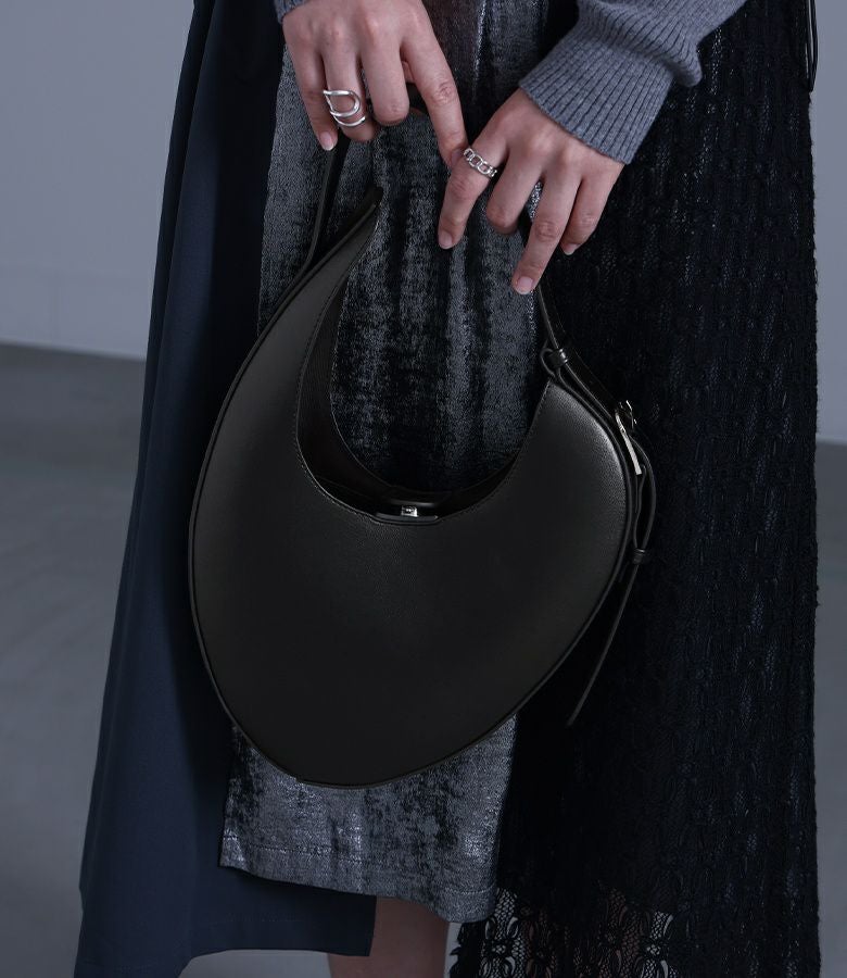 リサイクルレザーを使用した、モードな変形サークル型のオリジナルバッグ。バックルの効いたショルダーデザインがアクセントになります。