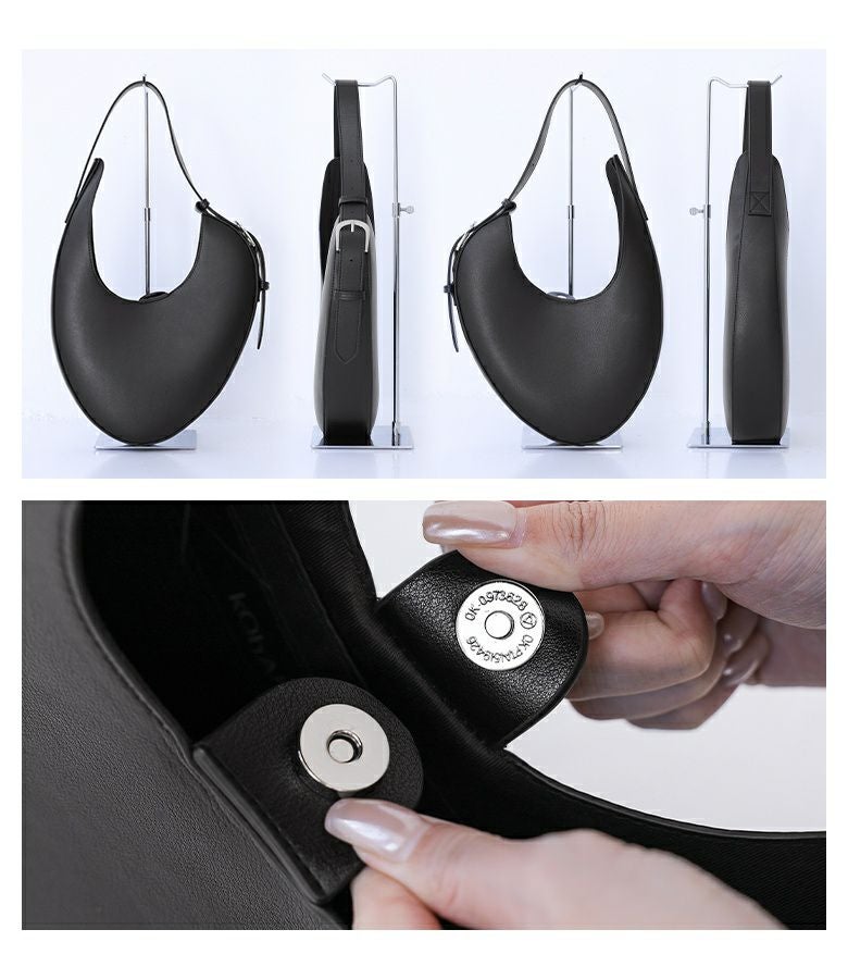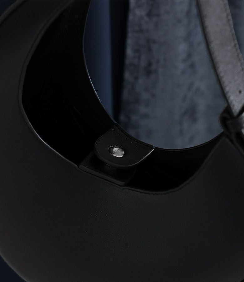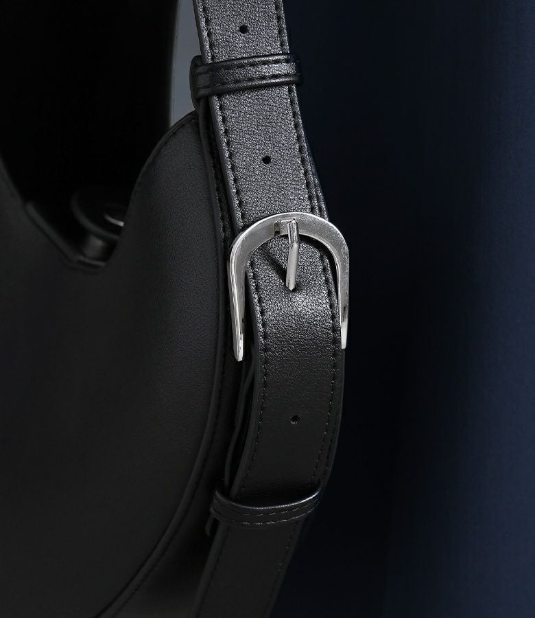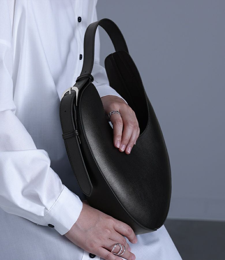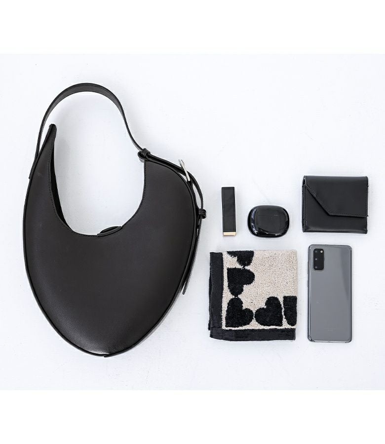 リサイクルレザーを使用した、モードな変形サークル型のオリジナルバッグ。バックルの効いたショルダーデザインがアクセントになります。