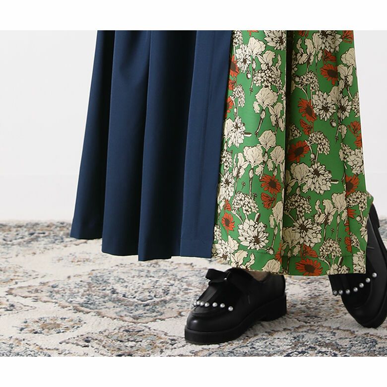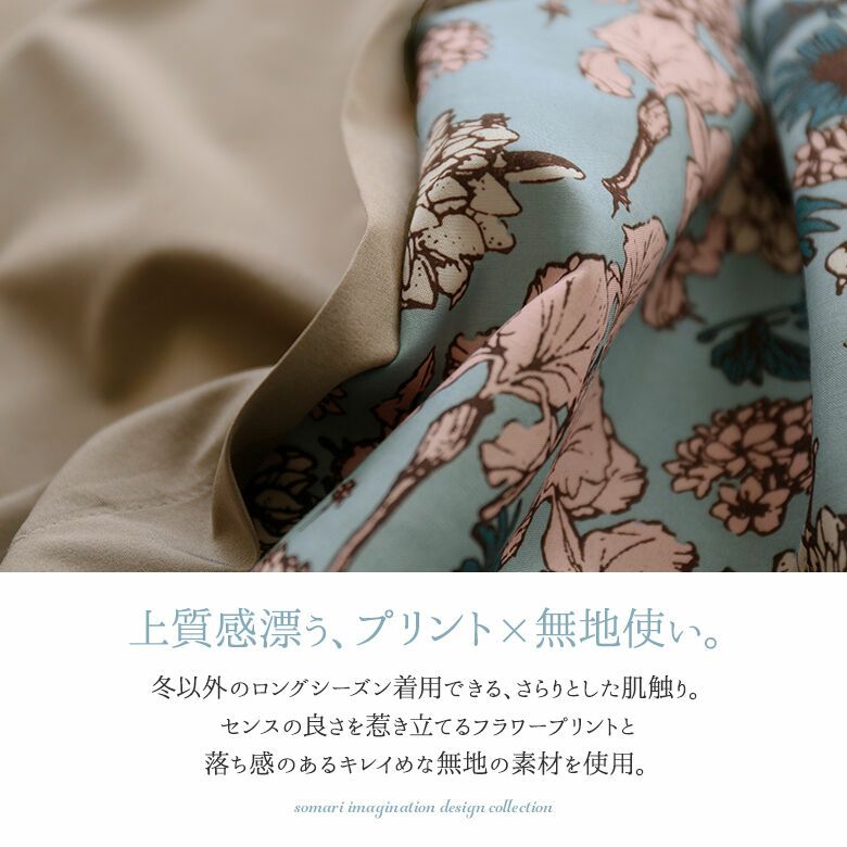 センスの良さを惹き立てる花柄と落ち感のあるキレイめな無地素材を使用。さらりとした肌触りでこれからの季節はもちろん、ロングシーズンご着用いただけます。