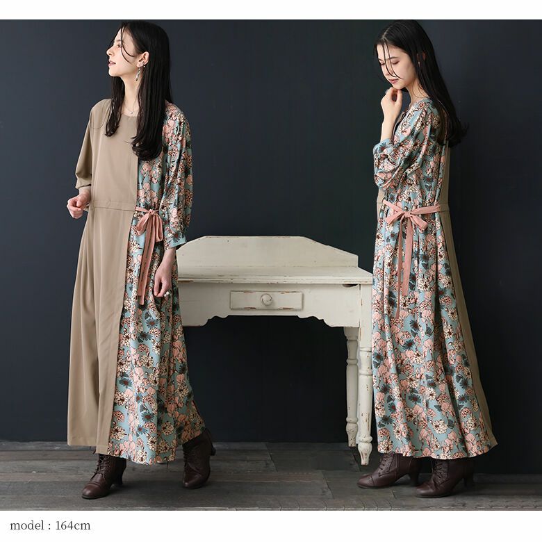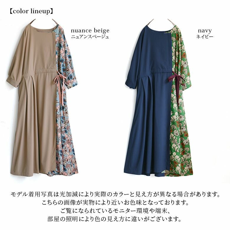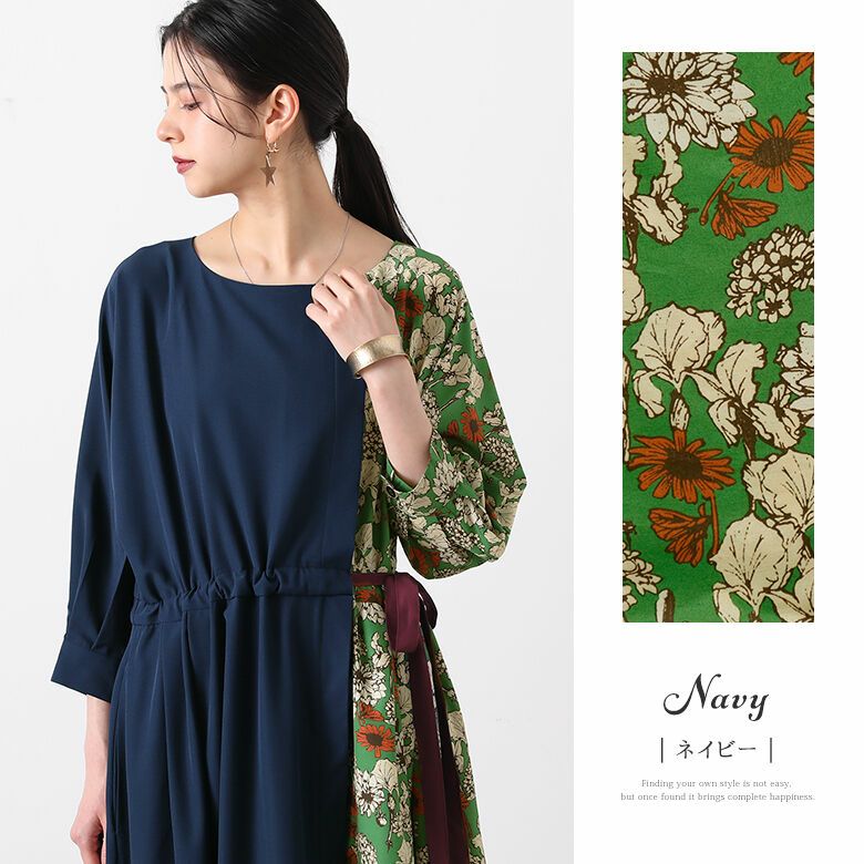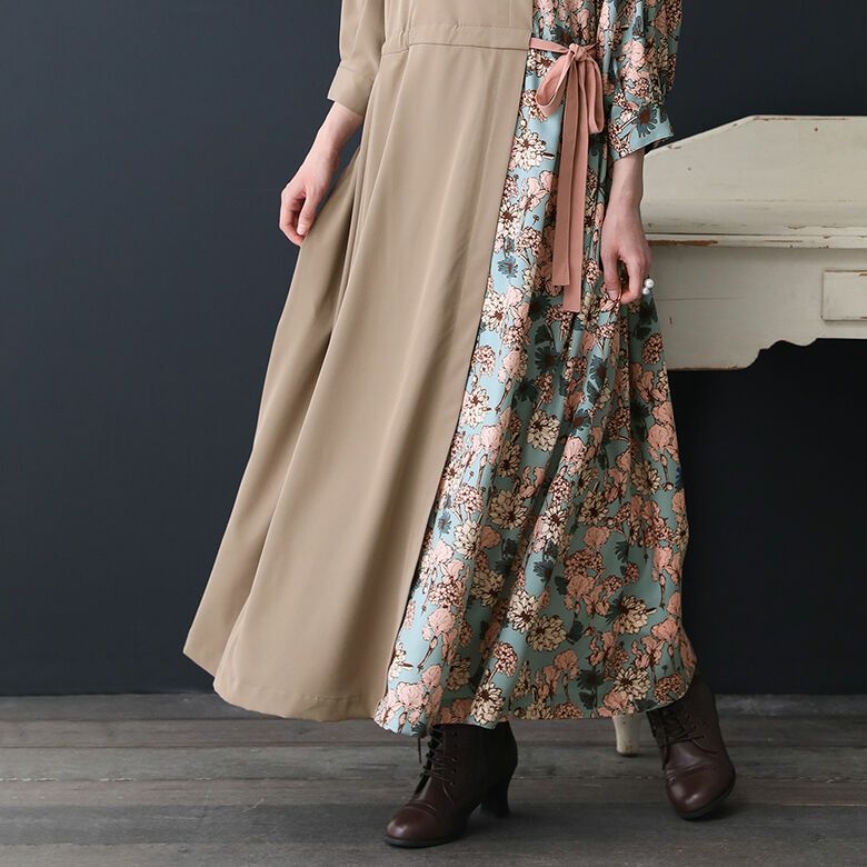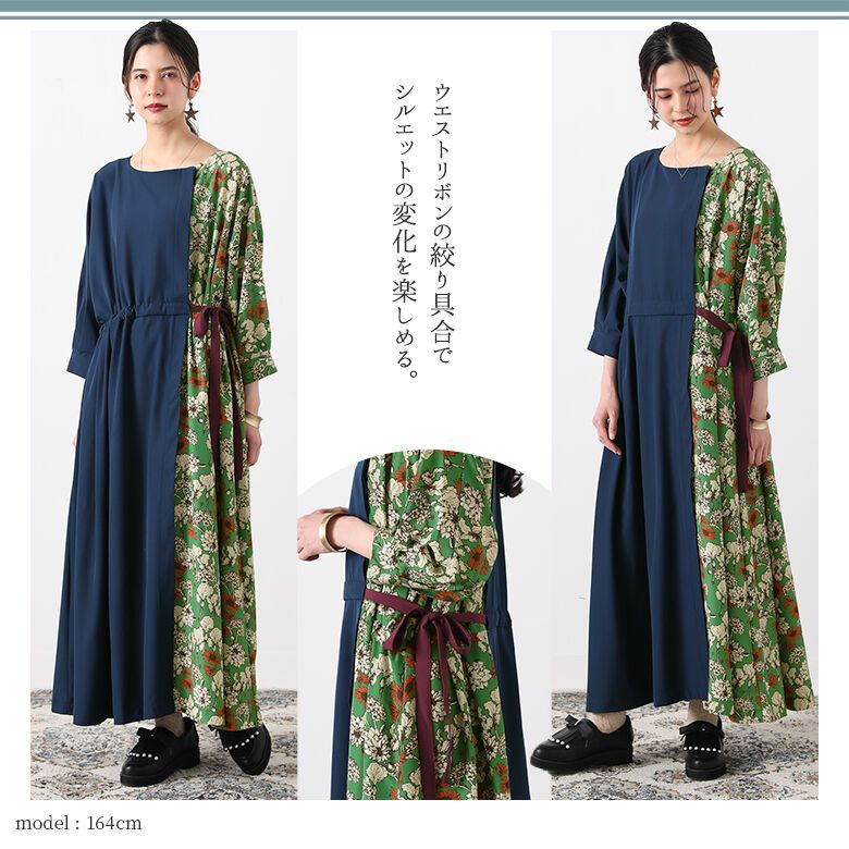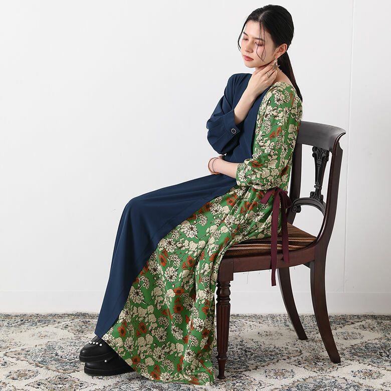 ネックラインの切り替え部分は前後でアシメデザインになっていて、レトロな花柄&無地の配色使いが着るだけでセンスを放つ。ウエストリボンの絞り具合でシルエットの変化を楽しめるから、着回し効果も期待できる一着です。