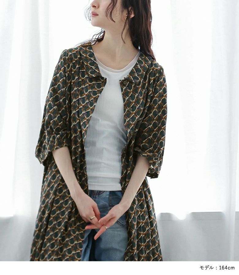 柄もデザインもとてもお洒落です。ワンピースとしても、羽織るようにして着ても良いです。身体158で、ふくらはぎがかくれました。足首がレースのレギンスとあわせるとかわいいです。