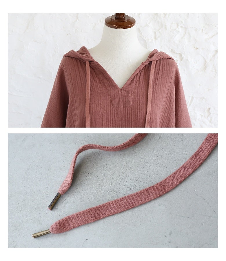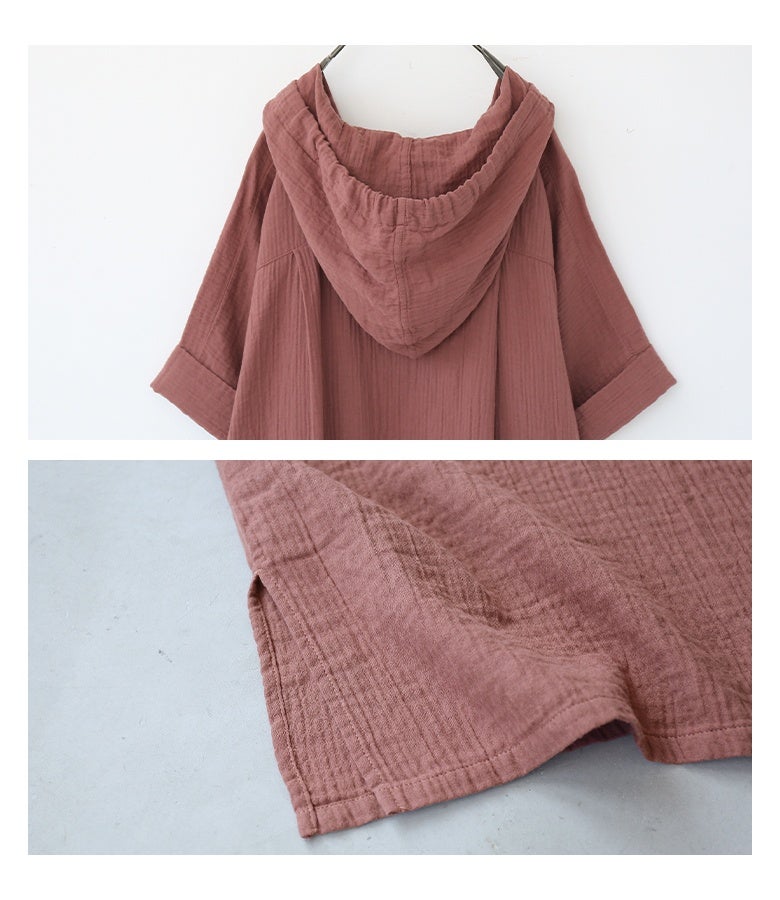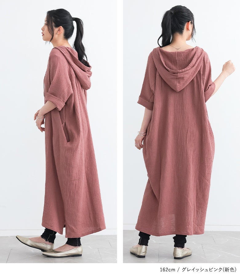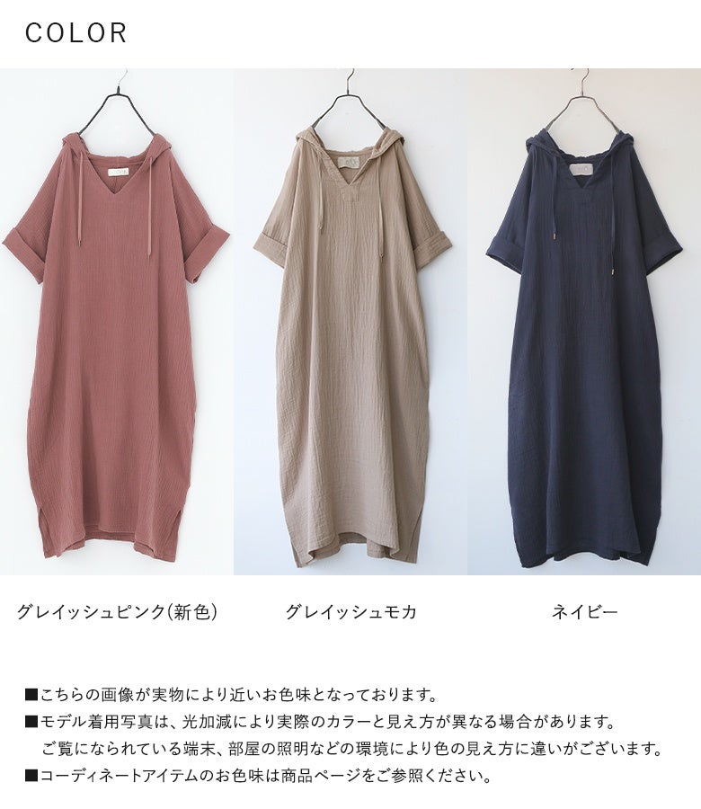 こちらはずっと探してたガーゼ素材のゆったりワンピースで、やっと見つけた!!って感じでとりあえず2着購入しました。着用感はとてもラクで汗をかいてもすぐに乾くしさ、涼しく着れます。一つだけ残念だなぁと思うのが フードの重さなのかでネックラインが後ろに引っ張られて苦しくその都度手前に下げる作業をするのが少し残念です。生地もクオリティ高く価格帯も安いくらいだと思います。全カラー購入したいですがネックラインのことで検討中です。