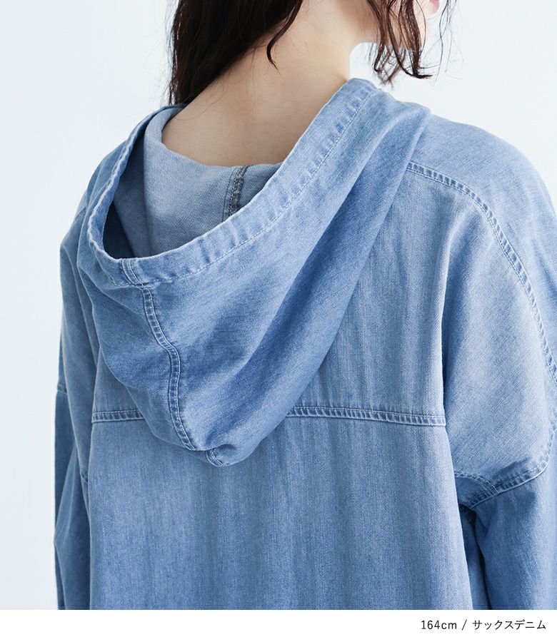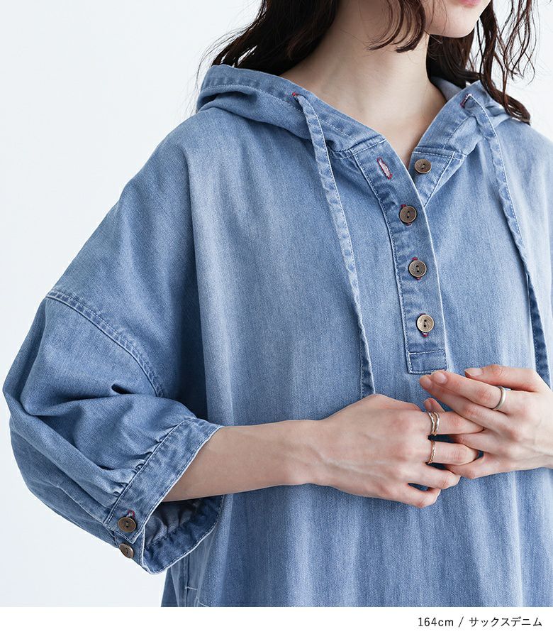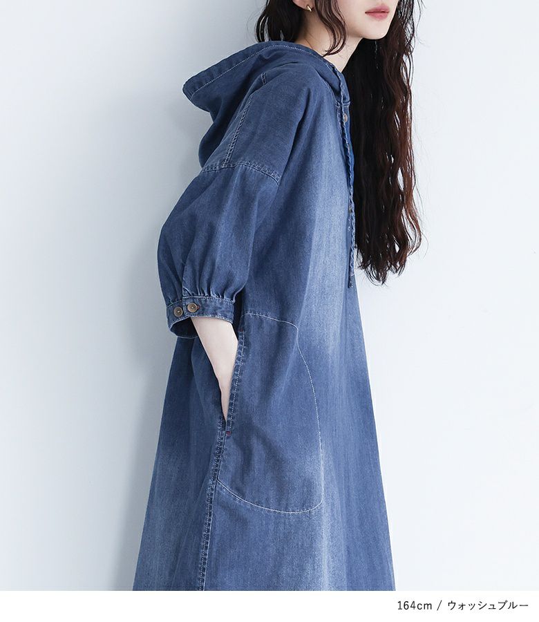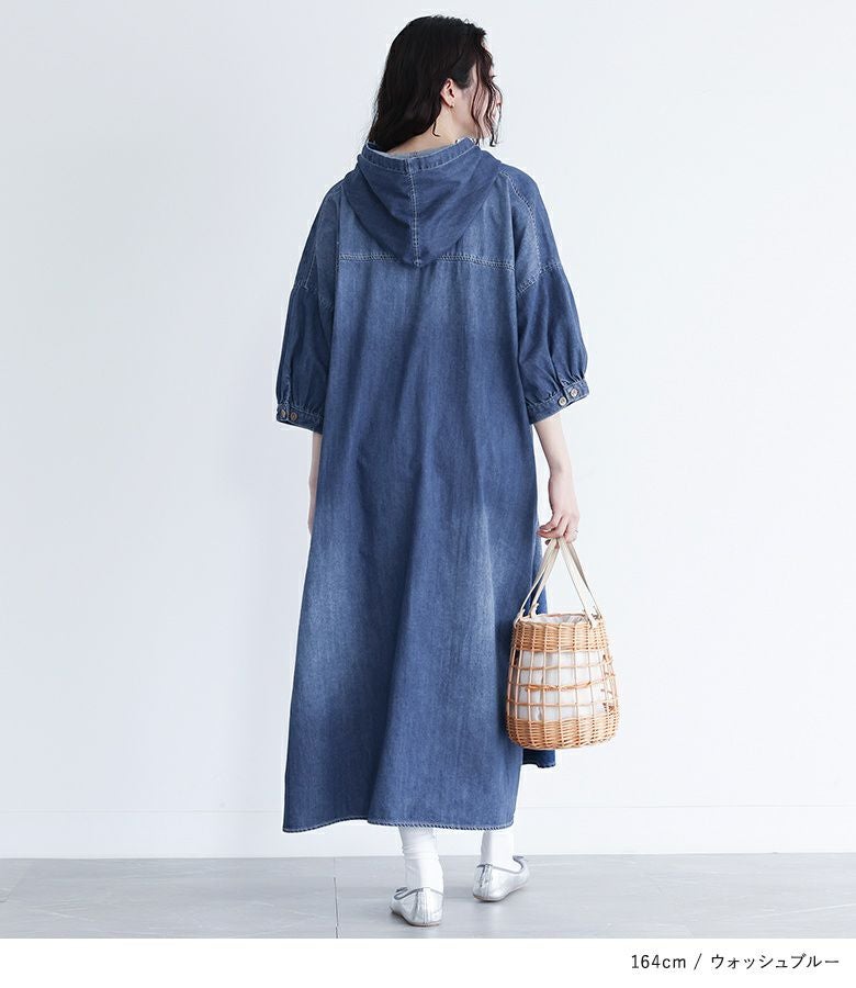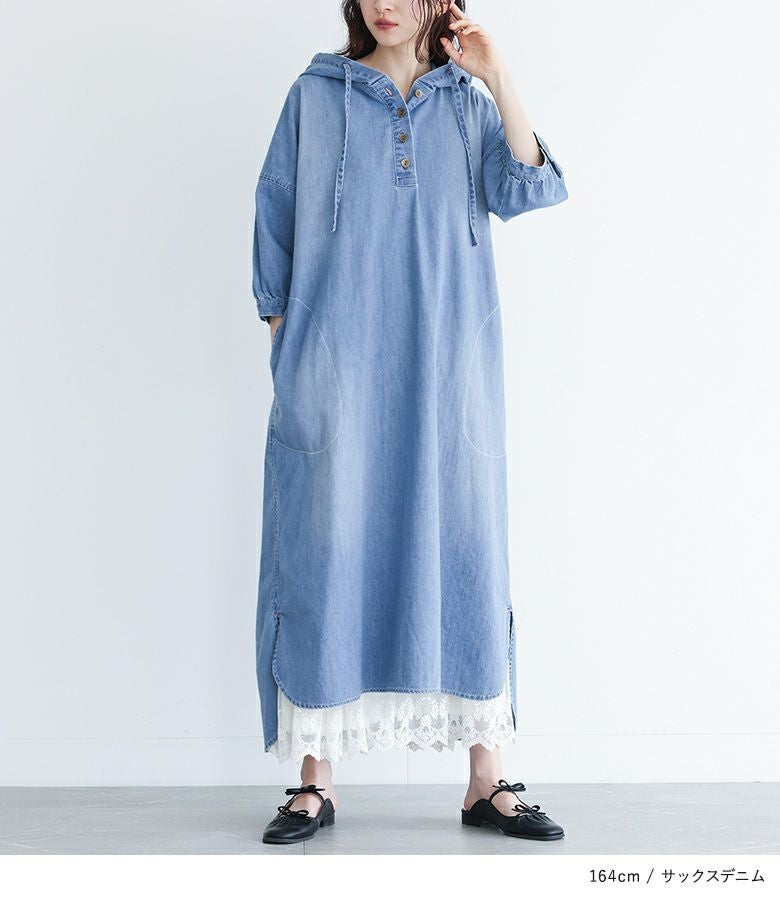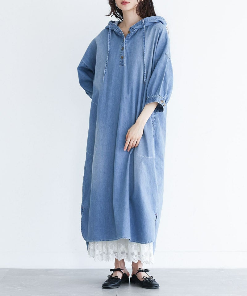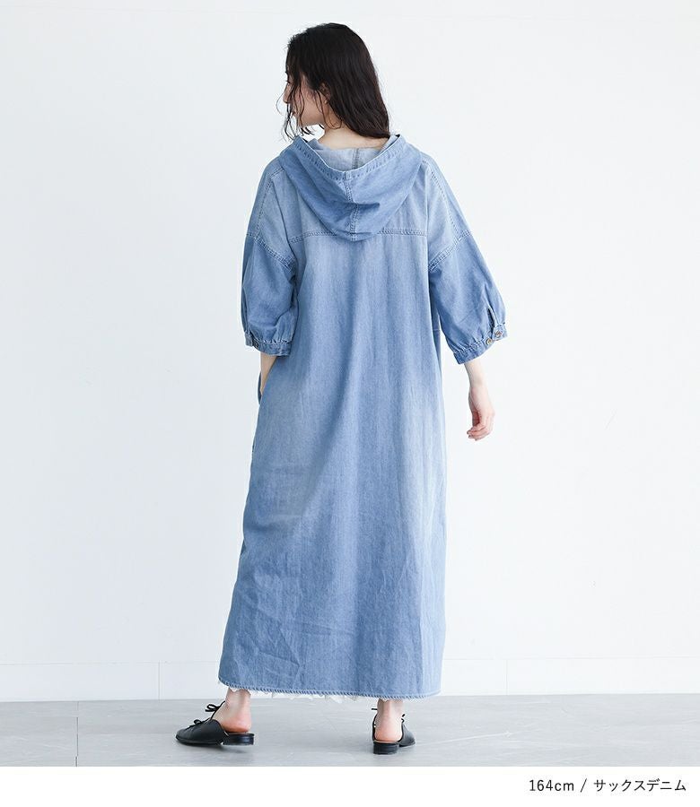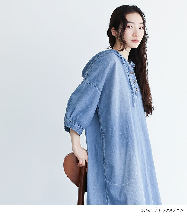 ナチュラルにお洒落を仕立てる≪somari imagination≫デニムフード6分袖ワンピースです。