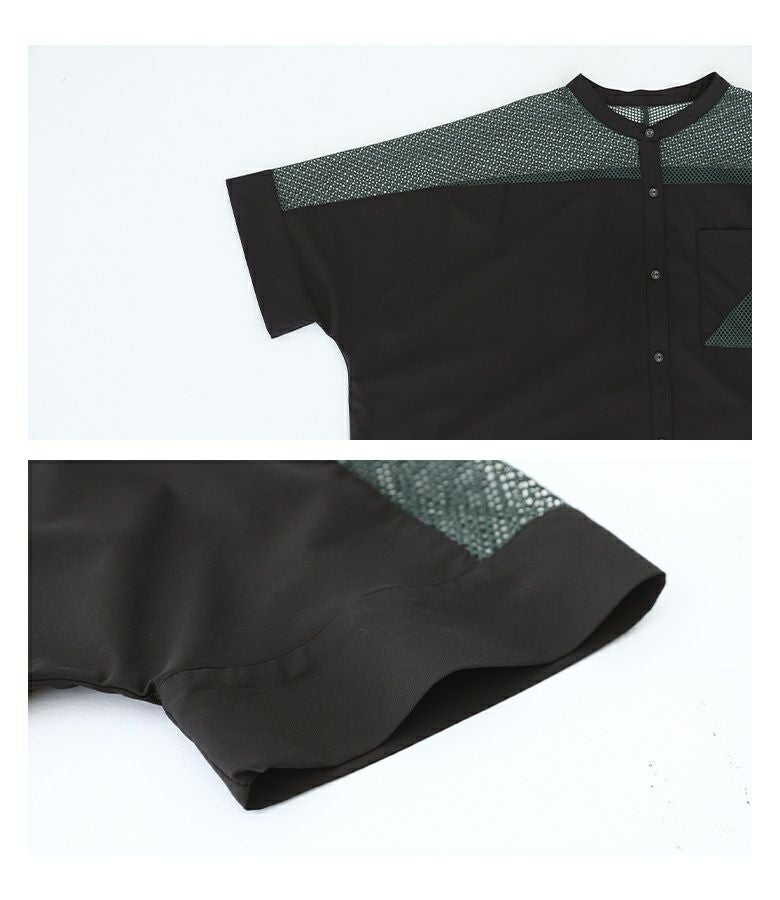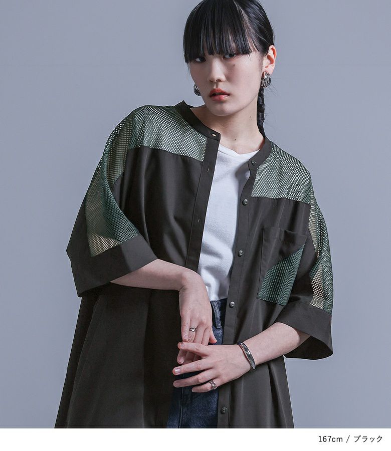 さらりと落ち感のある、肌触りの良い布帛生地。柔らかいメッシュ生地の異素材を切り替え、涼しげな印象に仕立てます。
